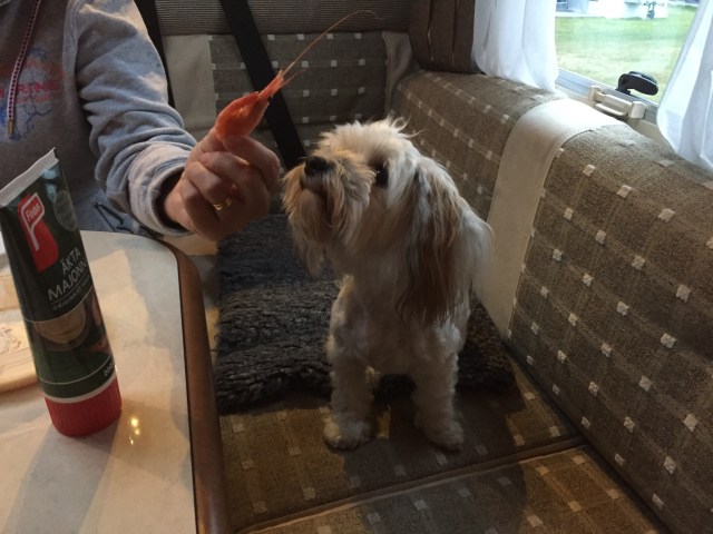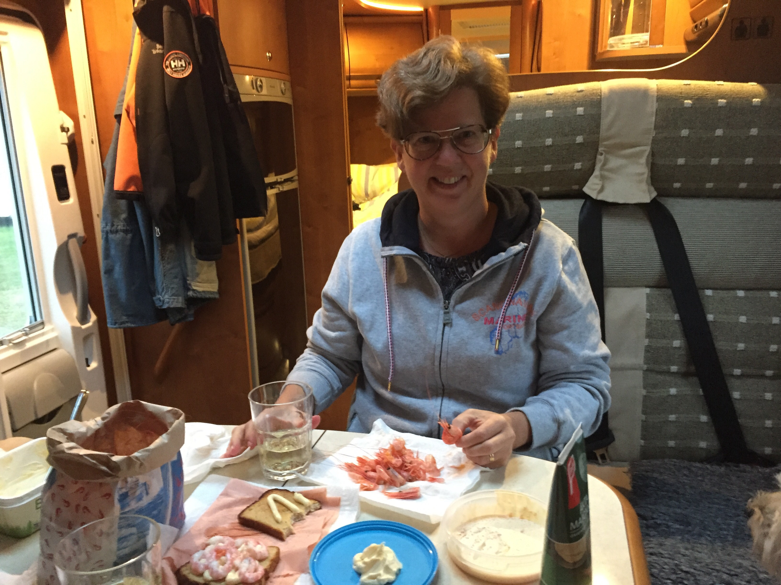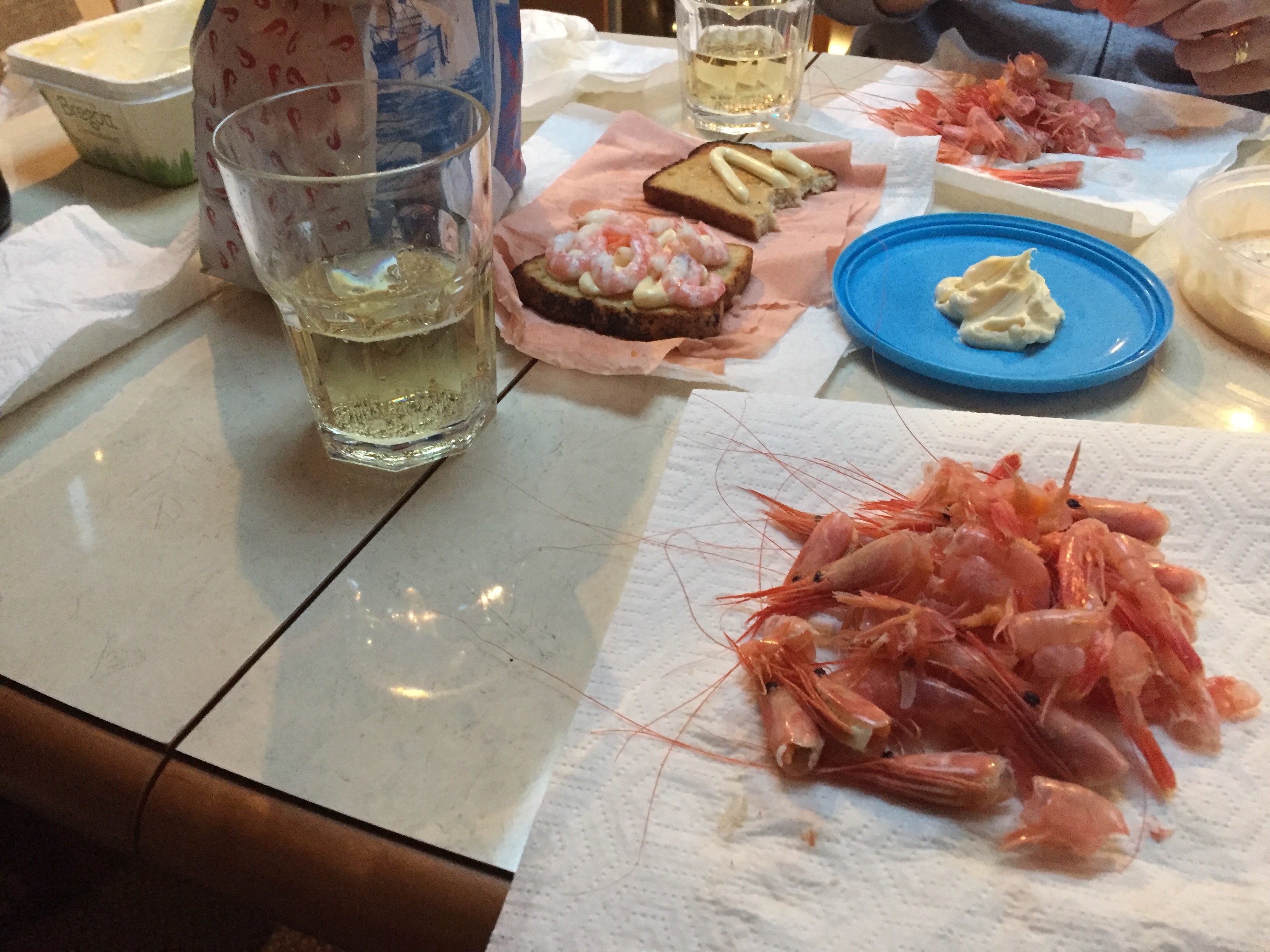 Sedan så plockade vi fram lite godsaker. Räkor och champagne även om det fick bli i dricksglas och utan tallrikar.