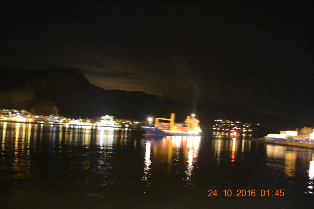 Strax efter midnatt får vi besked att det skall komma en containerbåt, så vi får flytta till nordänden av kajen.
