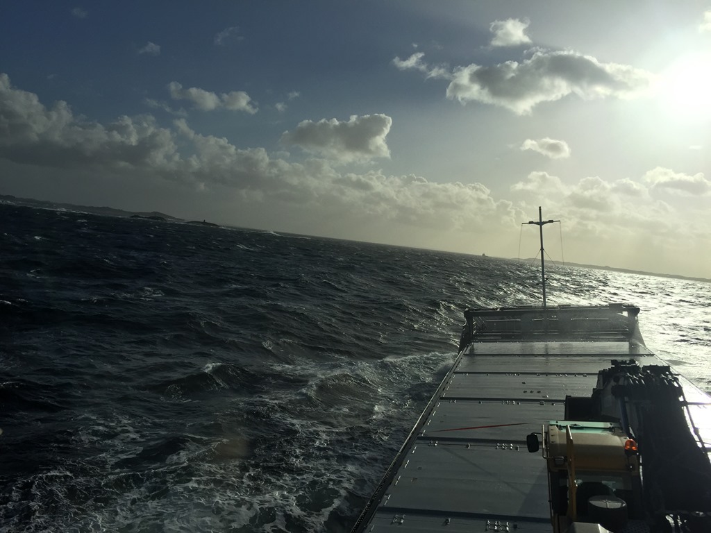 20:00 Kommer på vakt vid Börnestangen. Fortsätter söderut förbi Stord och genom Karmsundet. Nordvästlig vind 14-16 m/s fortfarande, men det ska avta under natten.