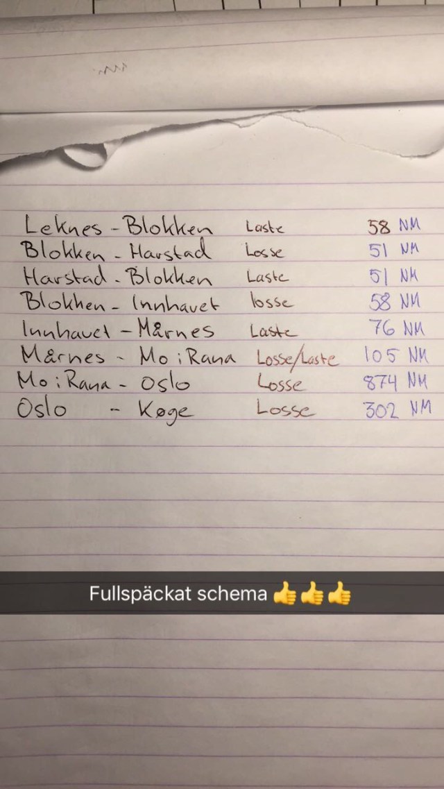 16:15 Förtöjda på Leknes och lossar. Kommer upp och får besked om flera fina turer.