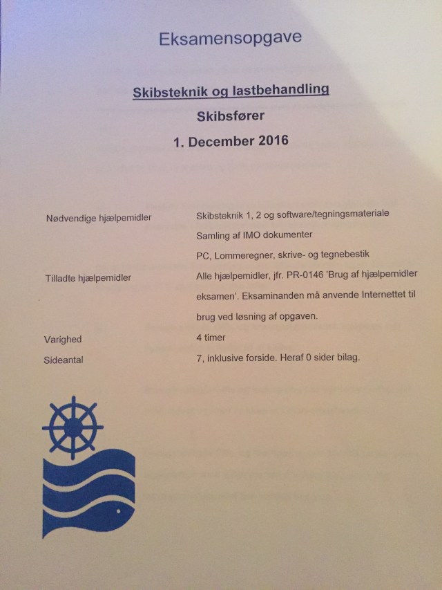Ser med en gång att första oppgaven är lite omständig och börjar på nummer 2. Är en opgave om surrning av last, som även hängde ihop med opgave 1. Men den får jag löst.