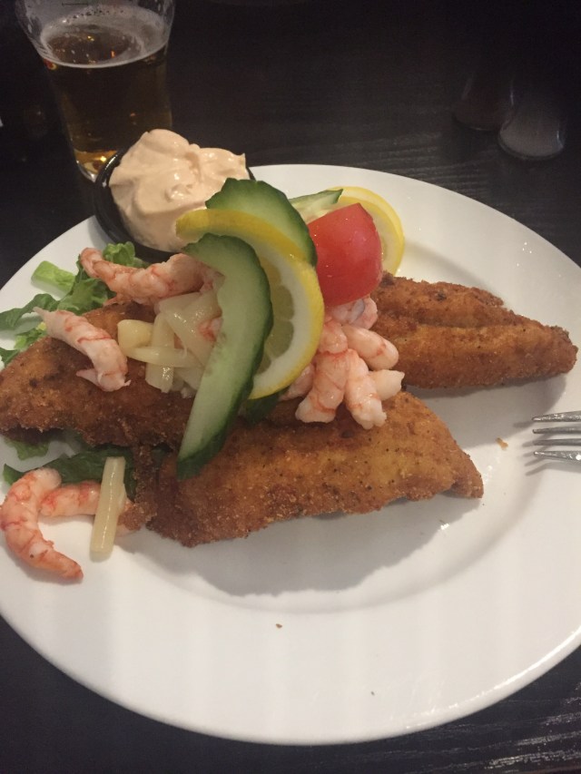 12:00 Examen avslutad och vi pratar lite med de andra. Sedan kör jag, John och Thomas bort till Jörgens spisehus. Beställer in varsitt stjerneskudd och varsin öl. Var väldigt god mat och det var verkligen färsk fisk och färska räkor.