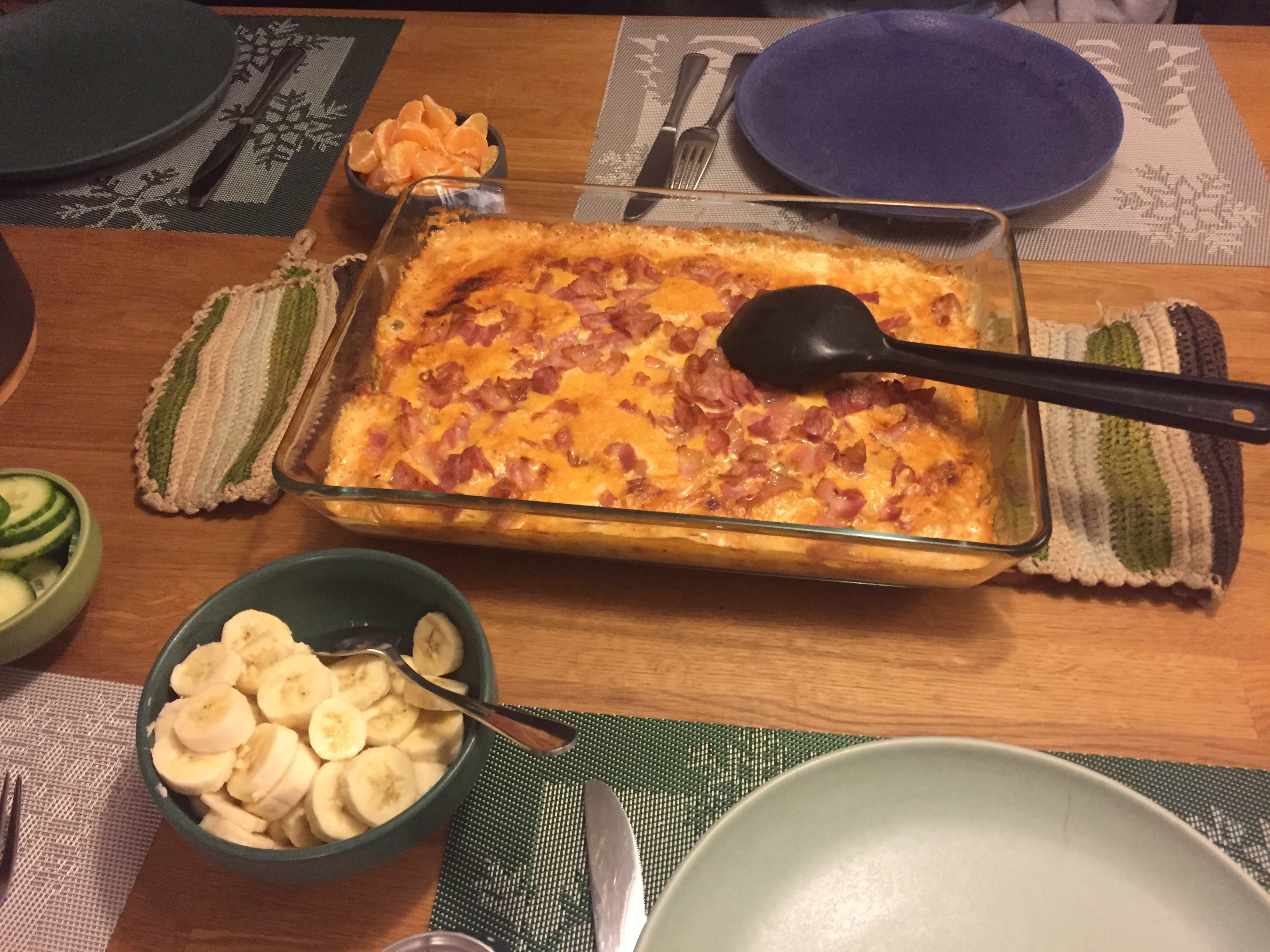 Till kvällen gjorde jag Flygande Jakob. Ris till vissa och blomkålsris till LCHF arna.