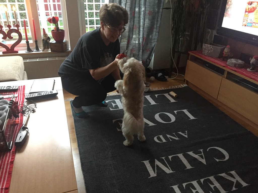 Chili får sin julklapp som hon försökt hämta ett flertal gånger.![]()