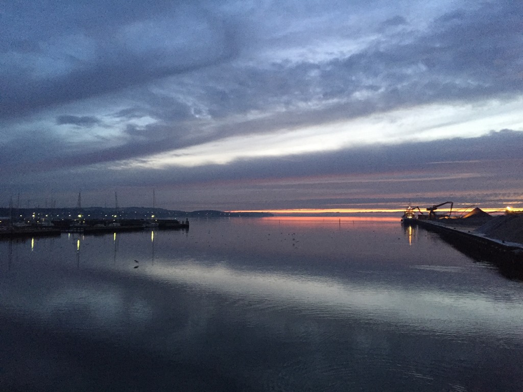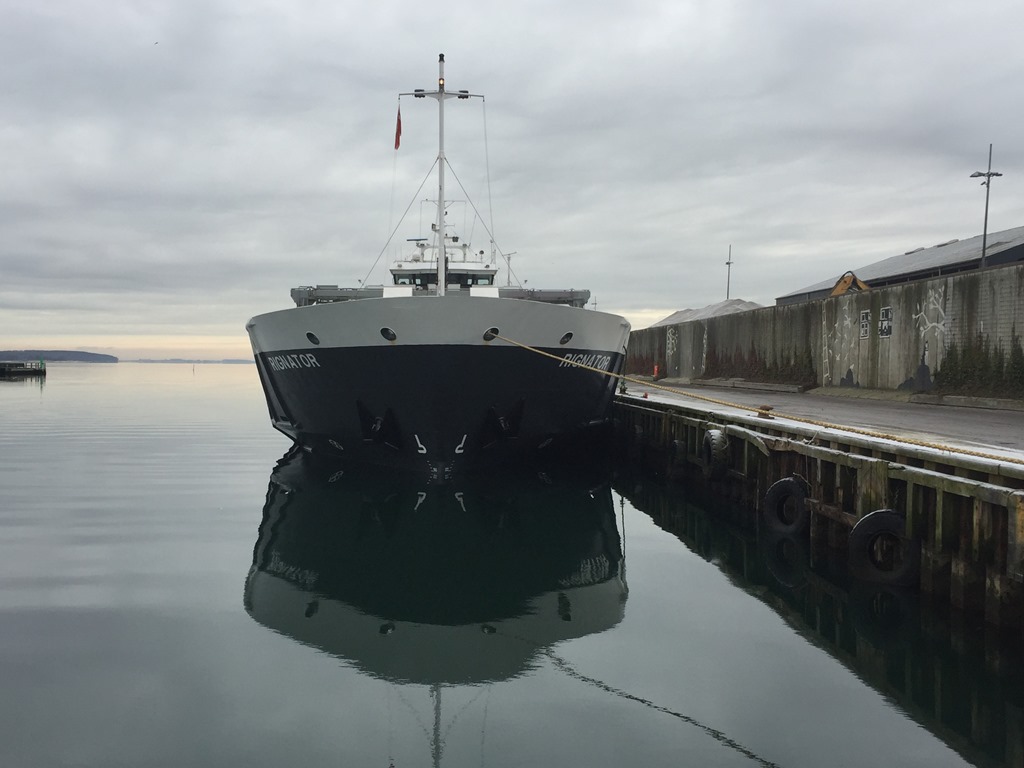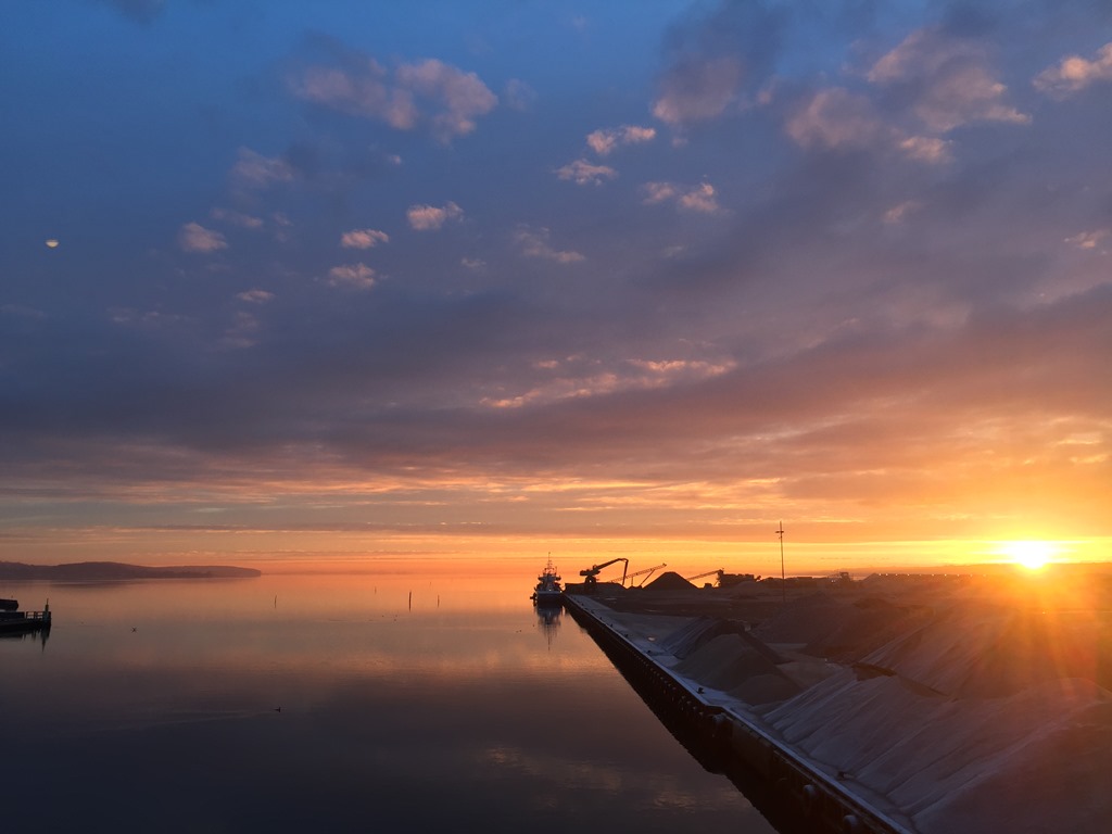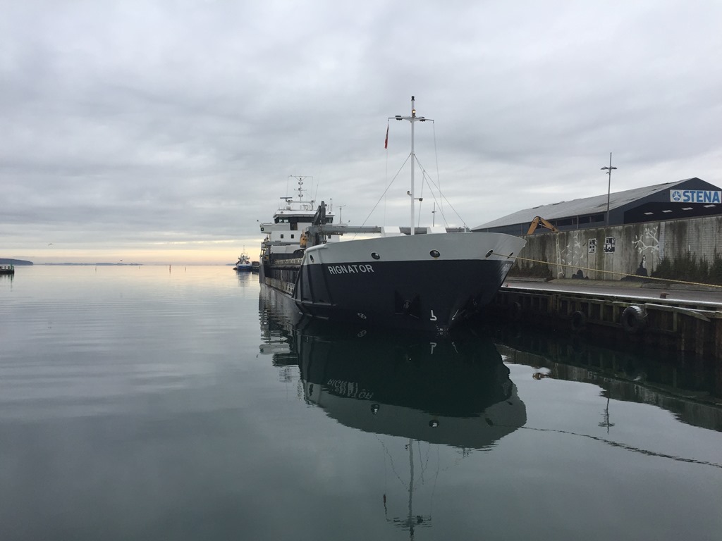 06:45 Förtöjda i Horsens och strax efter påbörjar vi lastningen. Går ner och äter frukost och sedan springer jag fram och tillbaka på kajen för att kolla djupgåendet så vi inte lastar för mycket. Vi får ju bara lasta till vinterlastmärket nu. Riktigt fin kall morgon.![]()