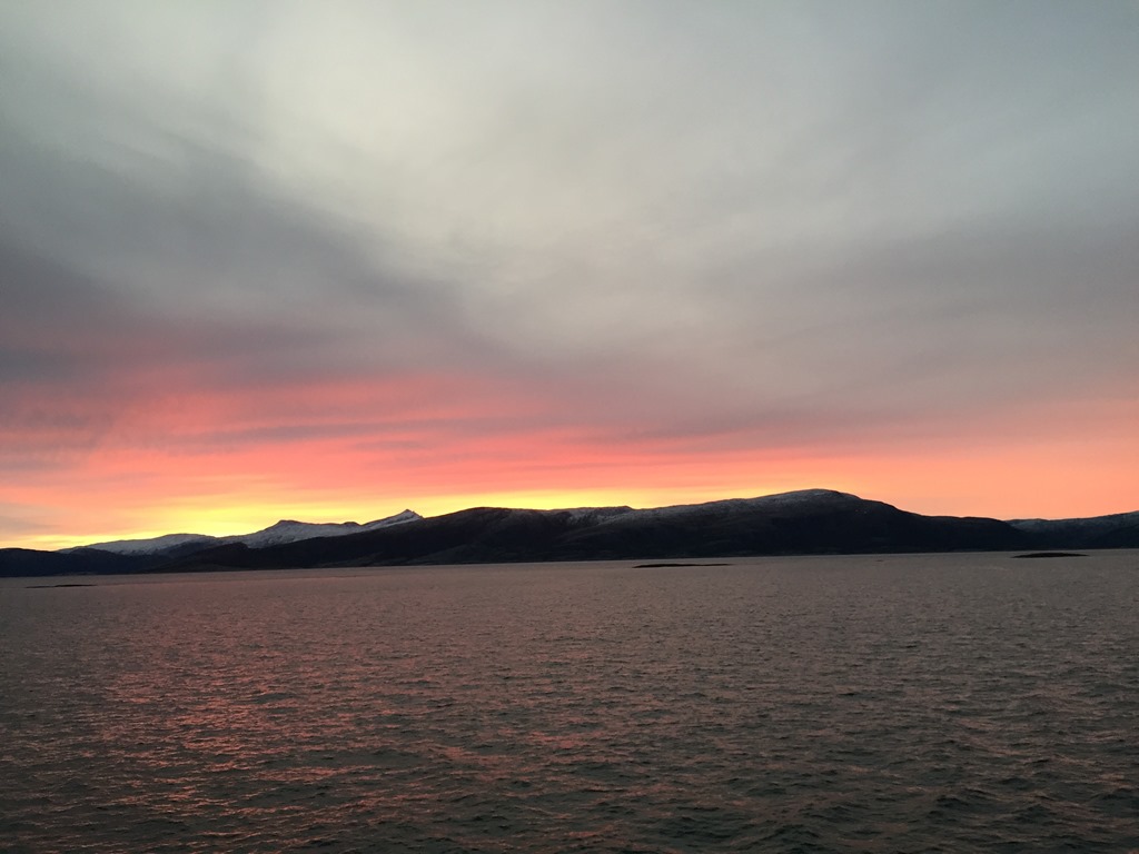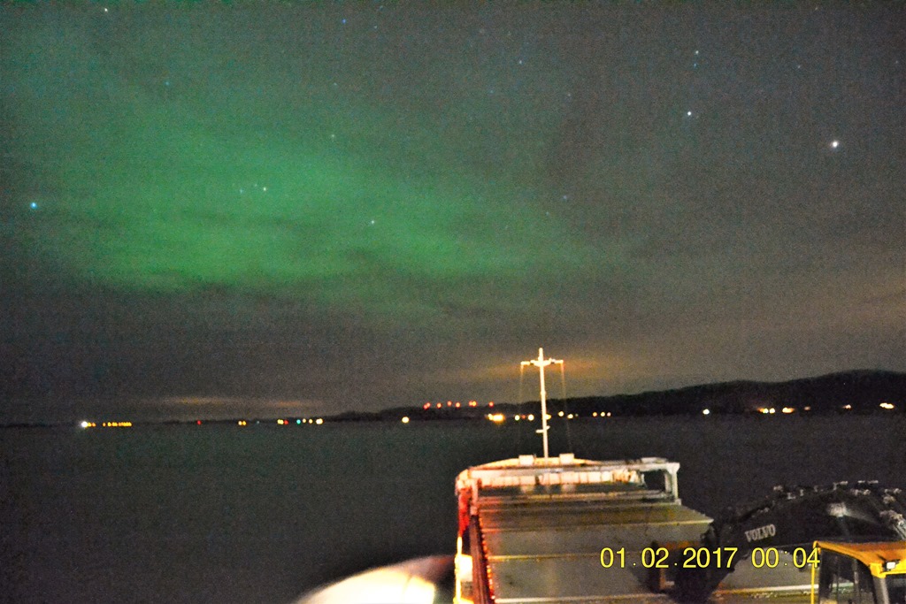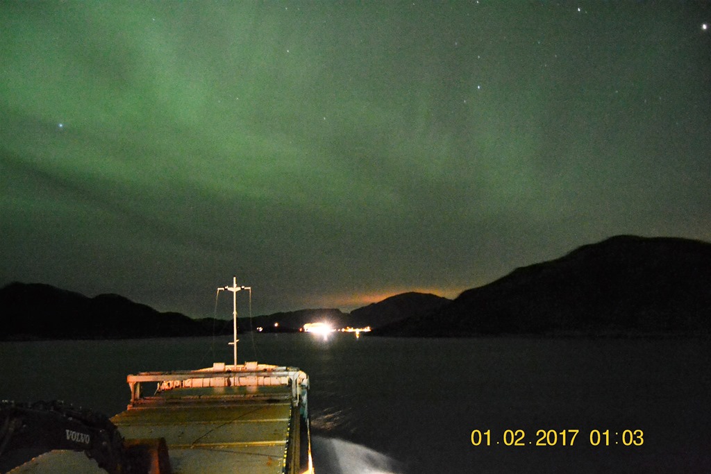 18:00 Vaknar när vi närmar oss Mo i Rana, vi får inte lossa idag så vi har fått en väntekaj. Jag går ut och hjälper till på däck med förtöjningen.