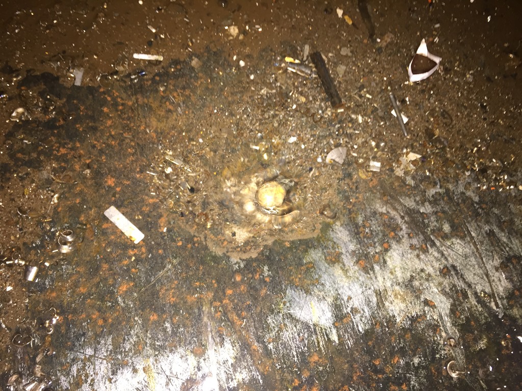 03:50 Styrman kommer och väcker mig och säger att de har funnit hål i lastrummet. Så det är bara att ta på sig och ge sig ut på däck. Går ner i lastrummet och ser att det är 2 hål in till ballast tankarna. 1 hål i tanktoppen och ett hål i sidan av lastlådan.![]()