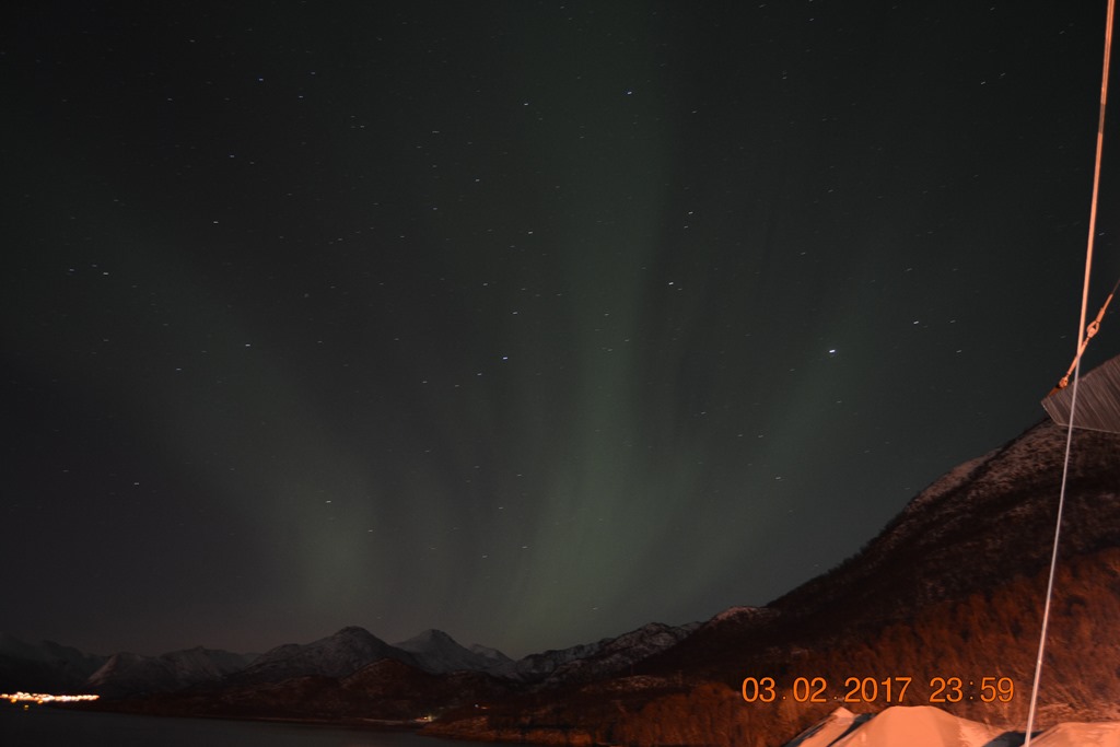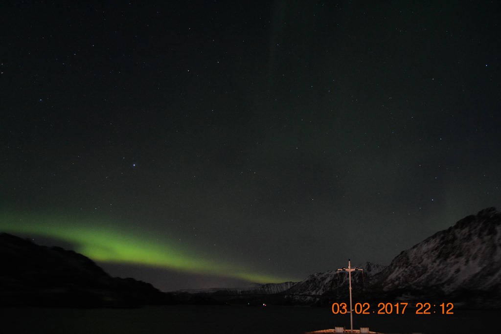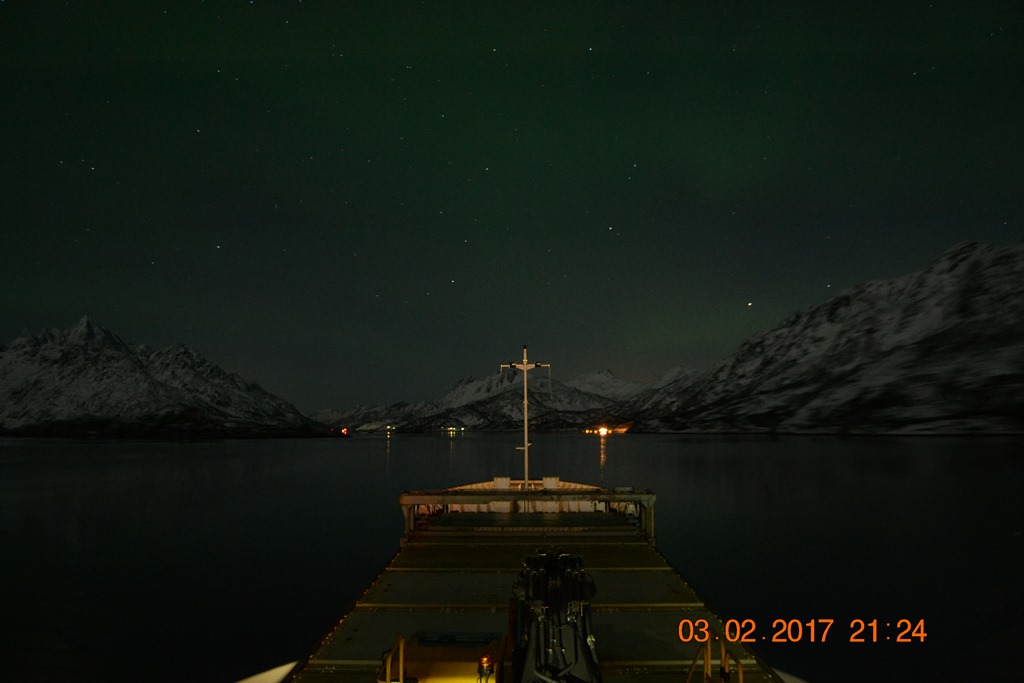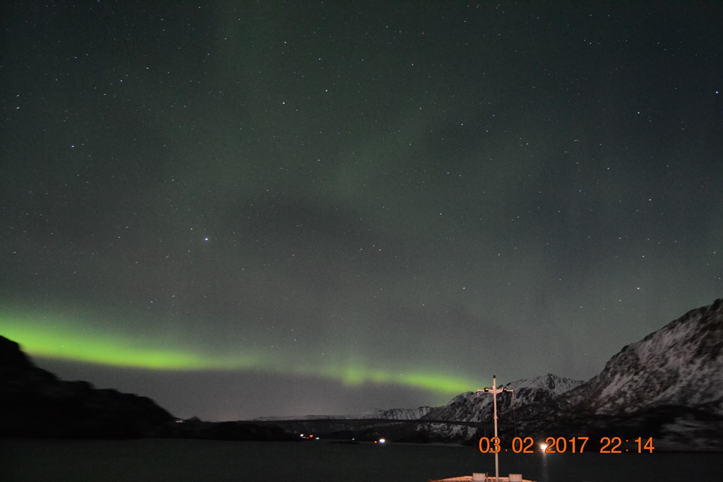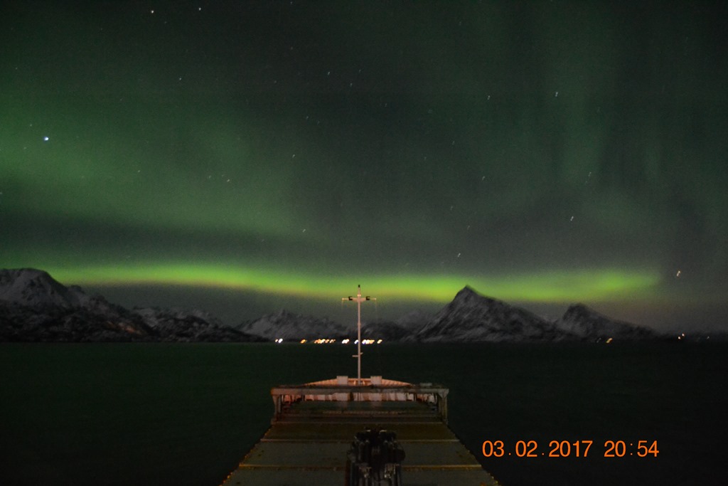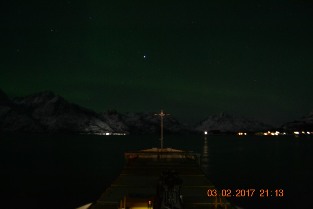 20:00 Kommer på vakt ute på Vestfjorden och går upp mot Raftsundet. Blir en riktigt fin kväll med massor av norrsken och stilla väder.![]()