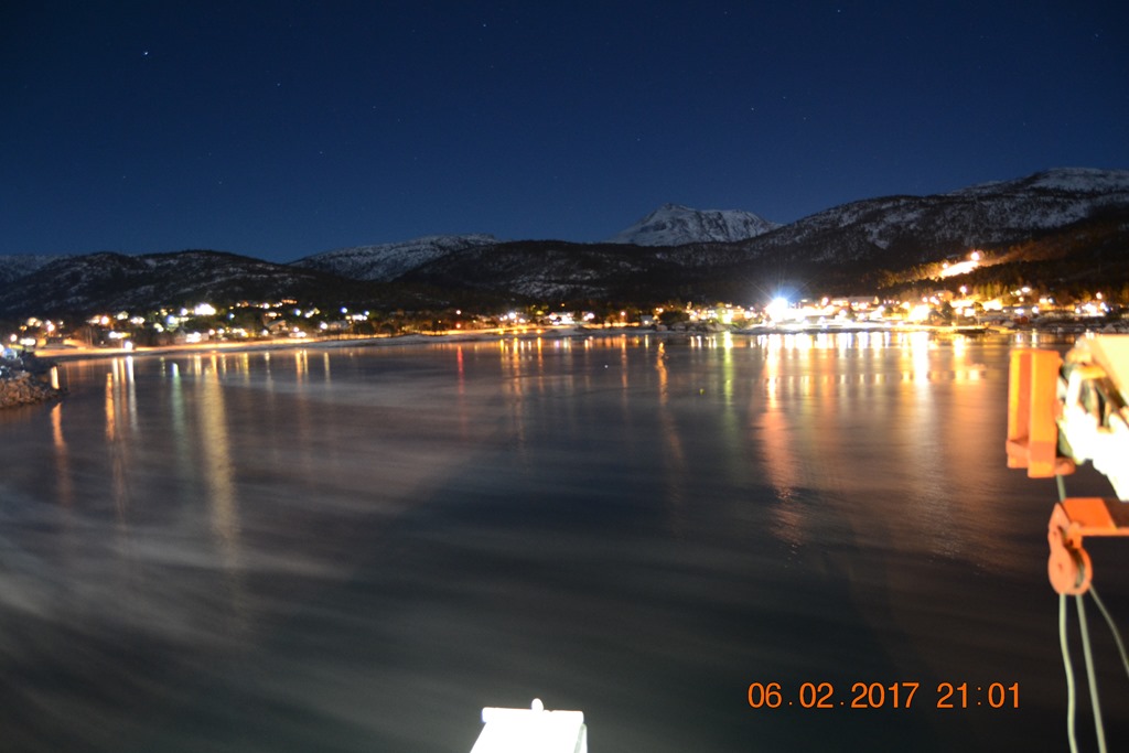20:00 Kommer på vakt igen och ringer till båten som ligger och lastar i Ballangen. De skall bli klara ikväll så vi bestämmer att vi avgår lite senare. Riktigt kallt ikväll och det ryker av vattnet.![]()