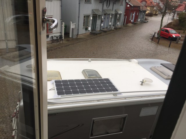 Ännu en regnig trist dag. Städade husbilen och torkade rent. Sedan en sväng till Fynda för att köpa en lite verktygslåda som jag kan ha i husbilen. Så slipper de ligga i skåpen inne i bilen. Hittade även lite annat som kan vara bra att ha. Kunde ta en bild från övervåningen som visar solpanelen.