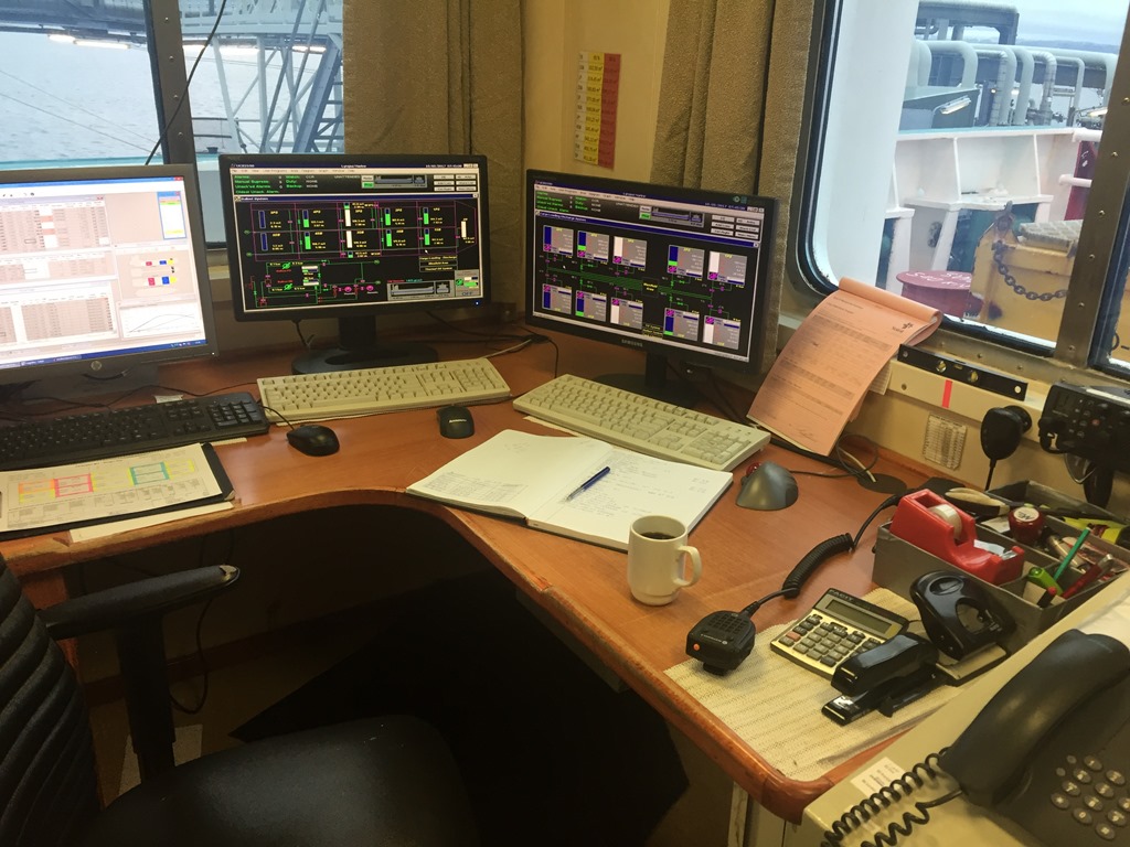 06:30 Vaknar och går ner i kontrollrummet för att se hur det går. Lastningen har precis börjat och jag pratar lite med den svenska styrmannen. Får mig lite kaffe och försöker komma in i systemet med lastning igen.![]()