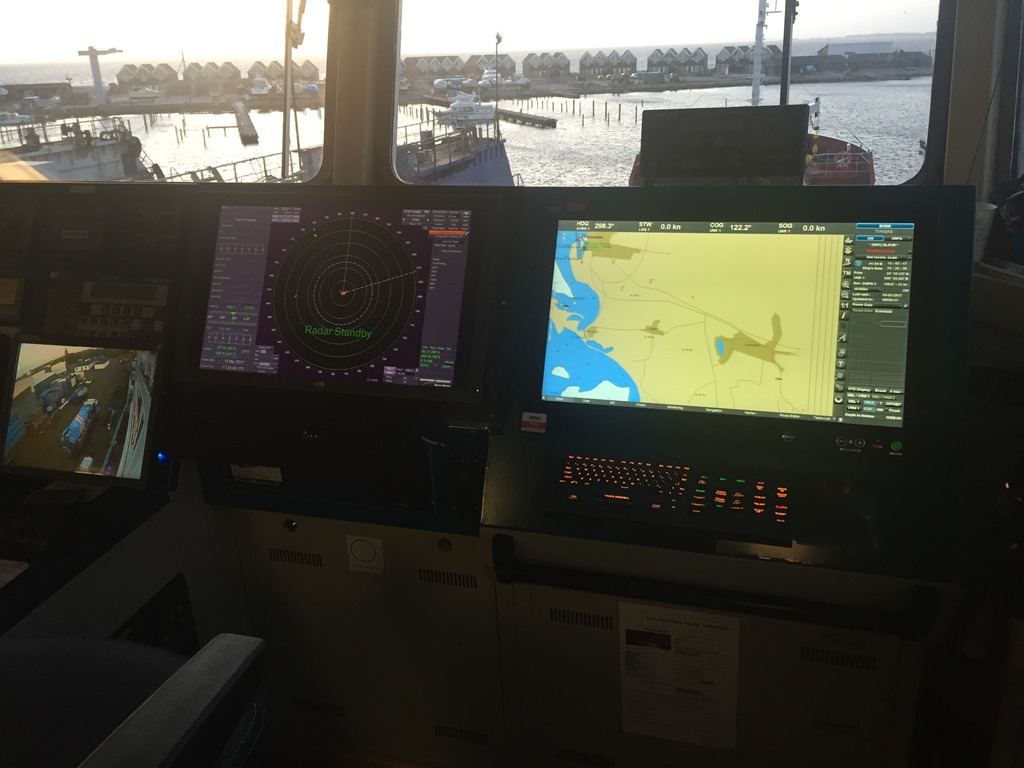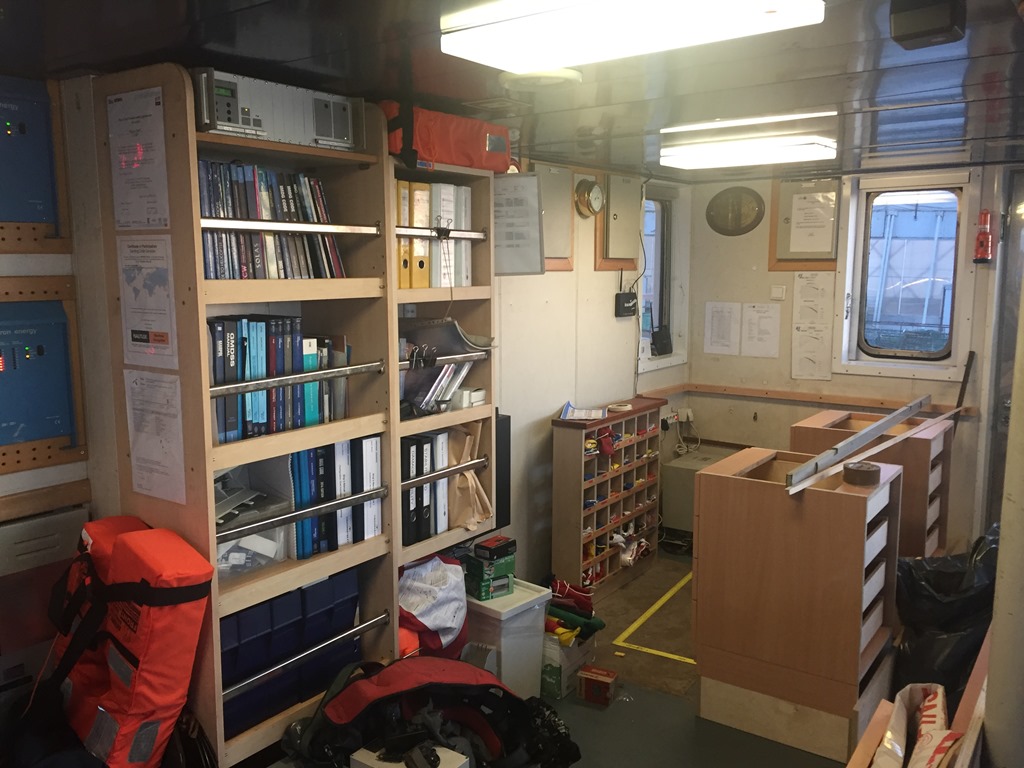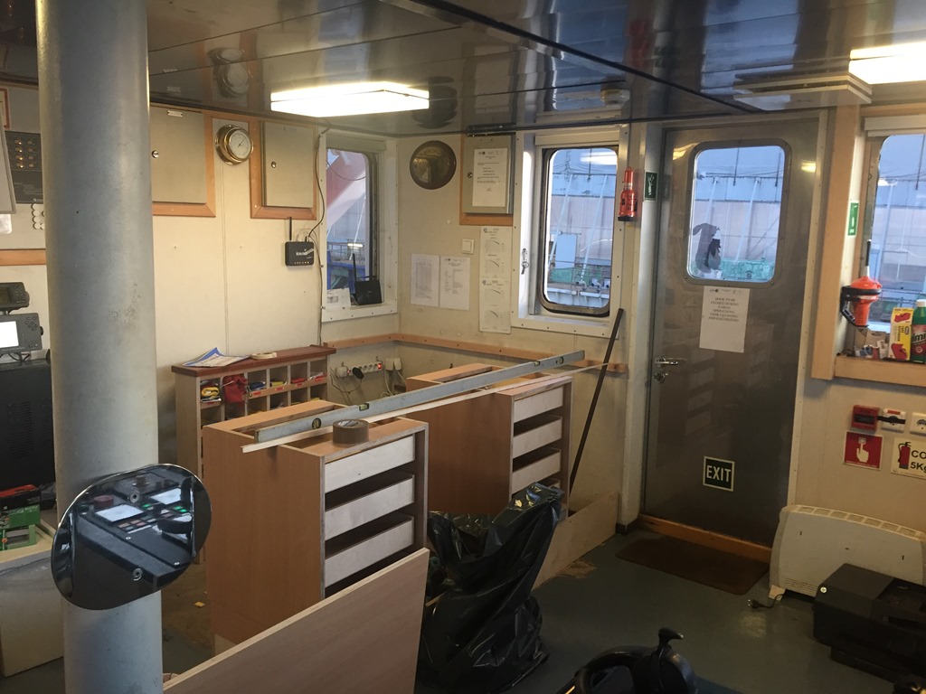 På bryggan är installationen av radarna klar och snickaren börjar sätta upp det nya skrivbordet.![]()