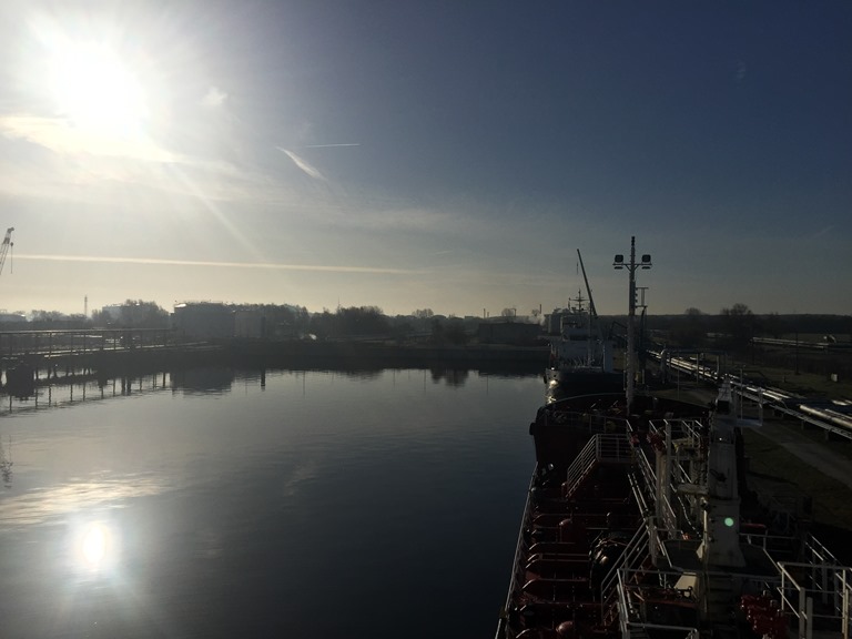 Äter kvällsmat och jag bokar lots inför morgondagen och sedan sätter jag mig med lite papper och börjar på avlösningsrapporten. Nu är det vindstilla ute och dimman har släppt igen, men nu ska jag sova så börjar vi lasta klockan 6 imorgon bitti.