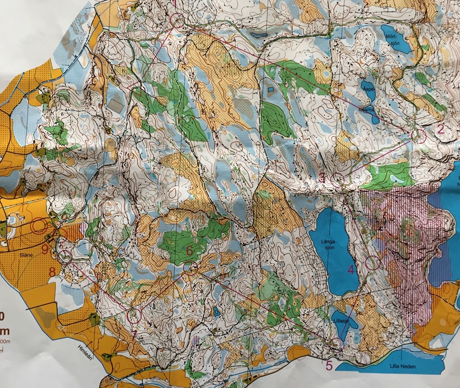 Österut längs samma höjdkurva och ovanför våtmarken sedan vika av på sydost längs med våtmarken och gölen upp till vägen. Fortsatte den österut och läste fel på kartan och trodde jag inte kommit så långt. Så när jag kom till vägkorsningen så skulle jag vikit av söderut men sprang istället österut längs höjdkurvan. Såg plötsligt sjön som jag genast upptäckte var Mörtsjön och förstod var jag var. Fortsatte ut till vägen och fortsatte den söderut till vändplatsen. Sedan var det bara kompasskurs ner mot punkthöjden där 2:an satt.