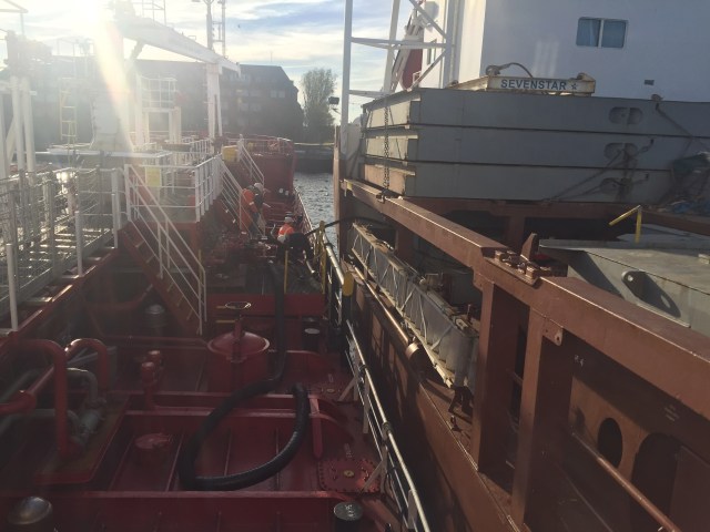 18:20 Förtöjda utsidan Elandsgracht för bunkring. Räknar med att det blir svårt att bestämma avgångstid eftersom det kan ta allt mellan1-4 timmar med dessa båtarna. Så jag säger till lotsen att jag går själv ut, vi är ju i ballast då och kan gå utan lots.