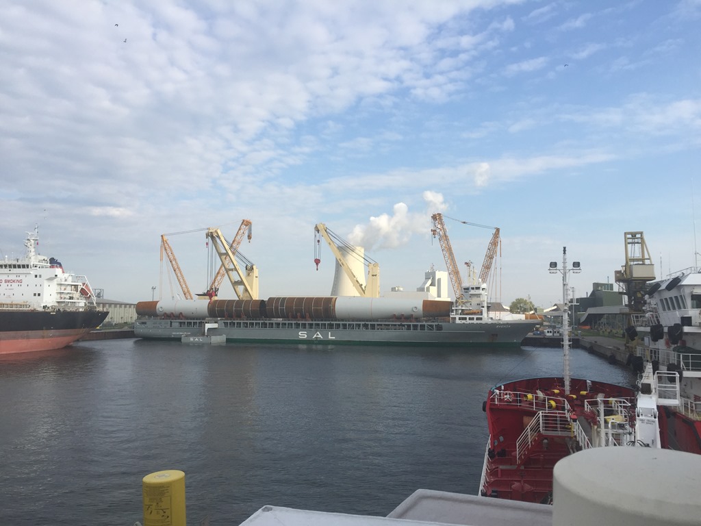 Svenja ligger och lastar vindkraftverk som skall placeras ute till havs.![]()