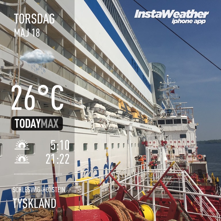 08:50 Förtöjda på utsidan Aidaluna för bunkring. Solsken och 25 grader varmt samt många åskådare när vi förtöjer.![]()