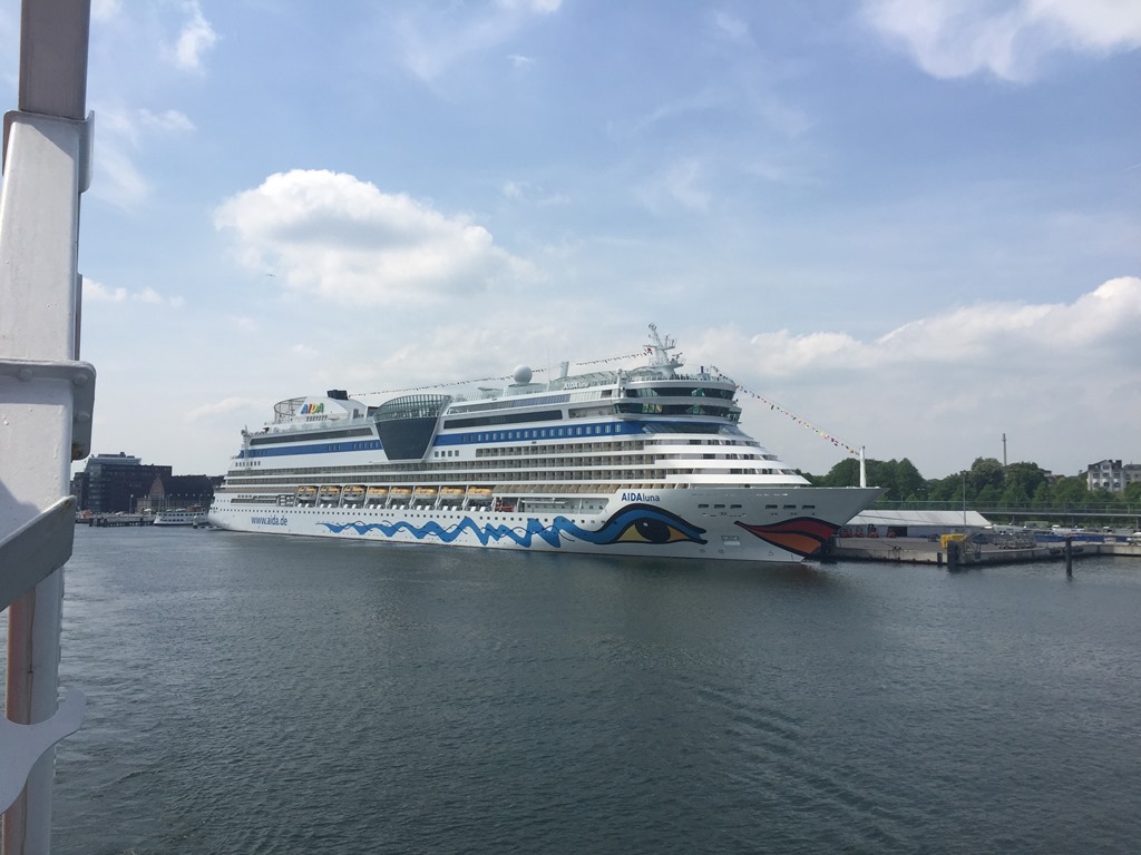 07:00 Vaknar och tar lite kaffe och väntar på att lotsen skall komma, Aidaluna är på väg in mot kaj.