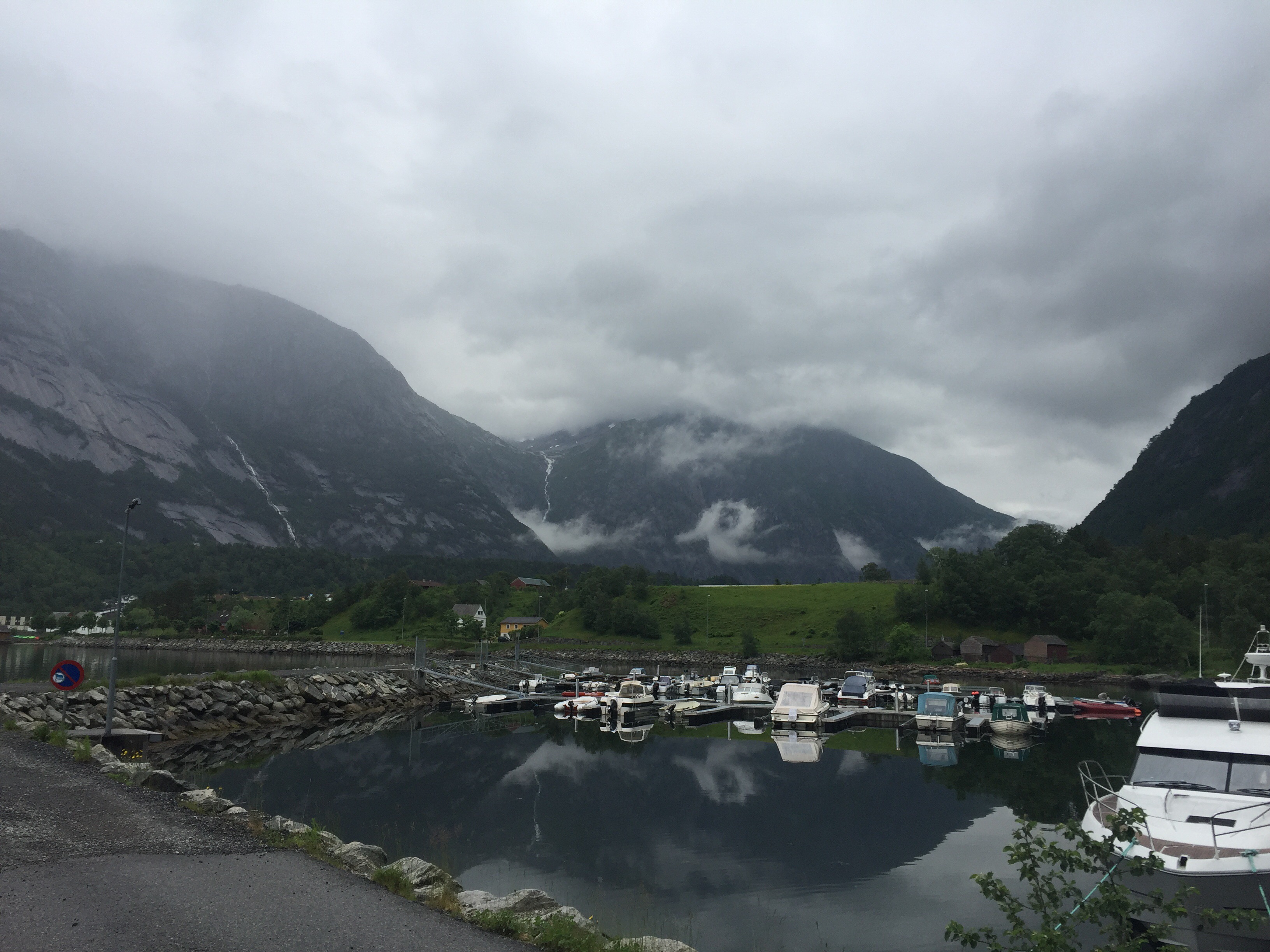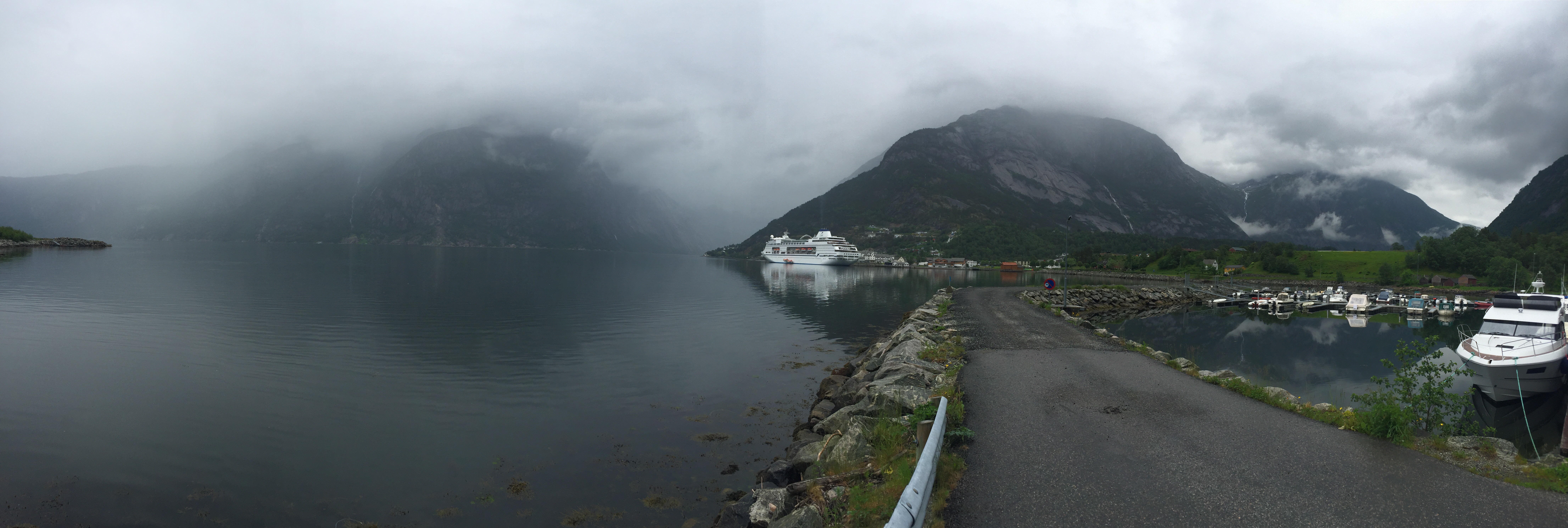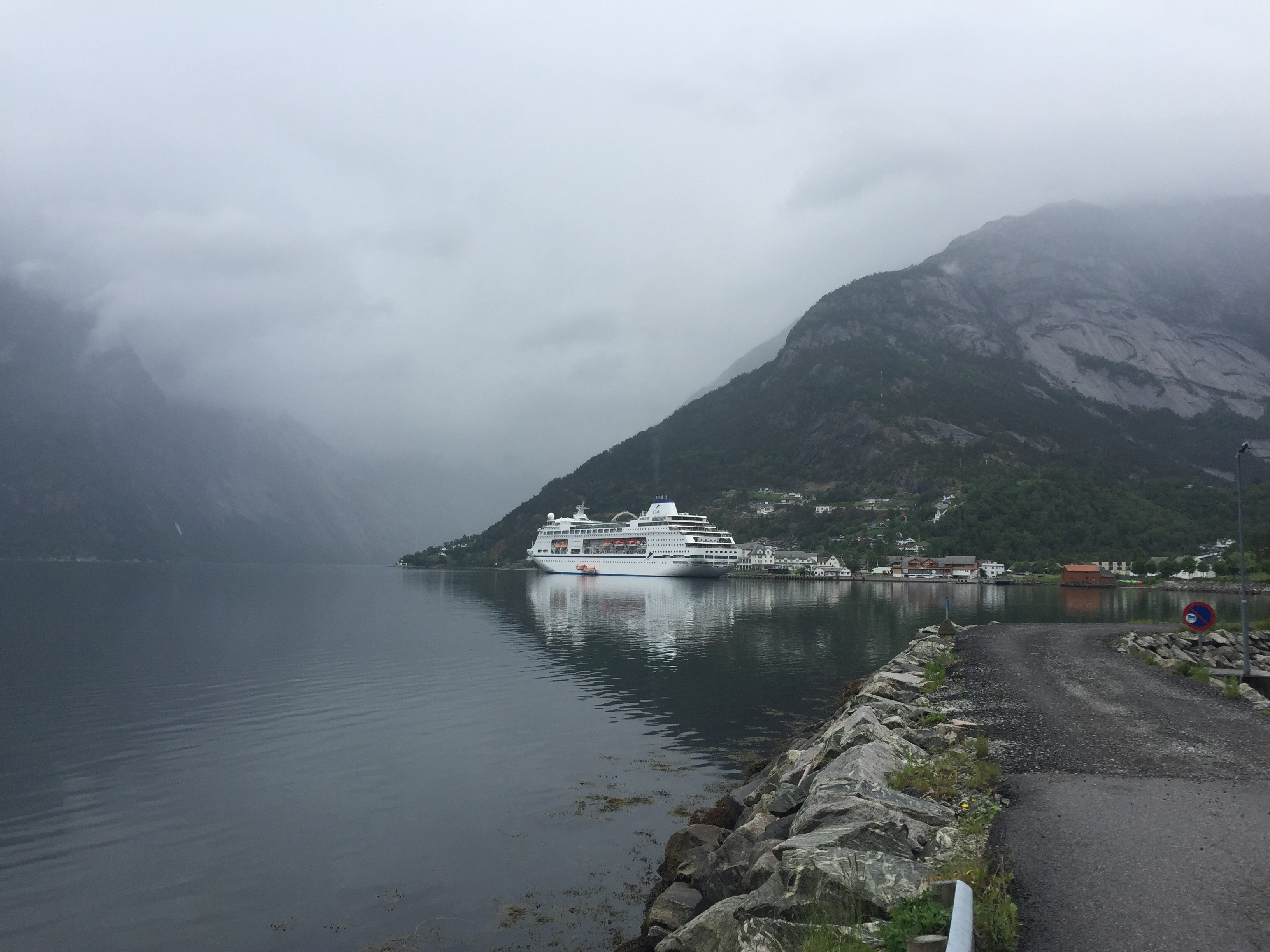 När vi kommit över Hardangervidda och kommer ner i Eidfjord så gör vi ett kort stopp. Ligger en stor kryssningsbåt till kaj här och det verkar klarna upp.