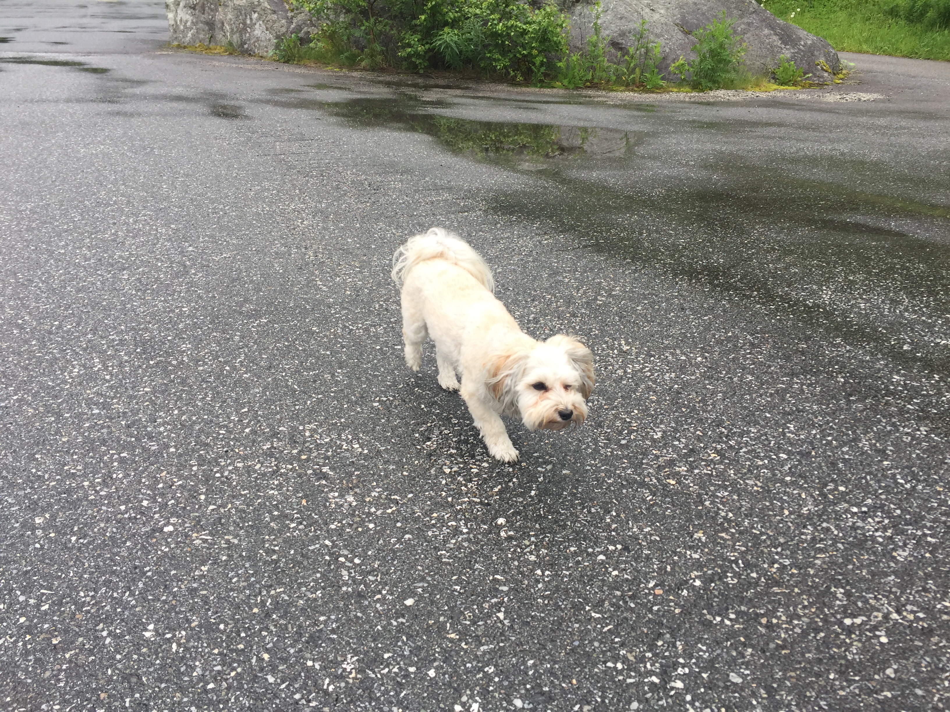 15:05 Framme i Fyllingsdalen i Bergen ich möts av Olaug. Vi bjuds på kaffe och jag tar Chili på en långpromenad.