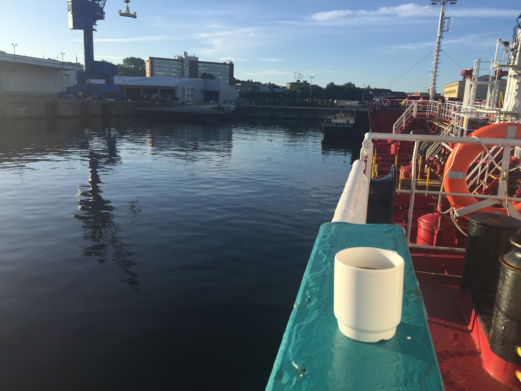 Senare under eftermiddagen när vi passerar Fehmarn belt så sätter jag mig framme på backen i solskenet och dricker kaffe.
