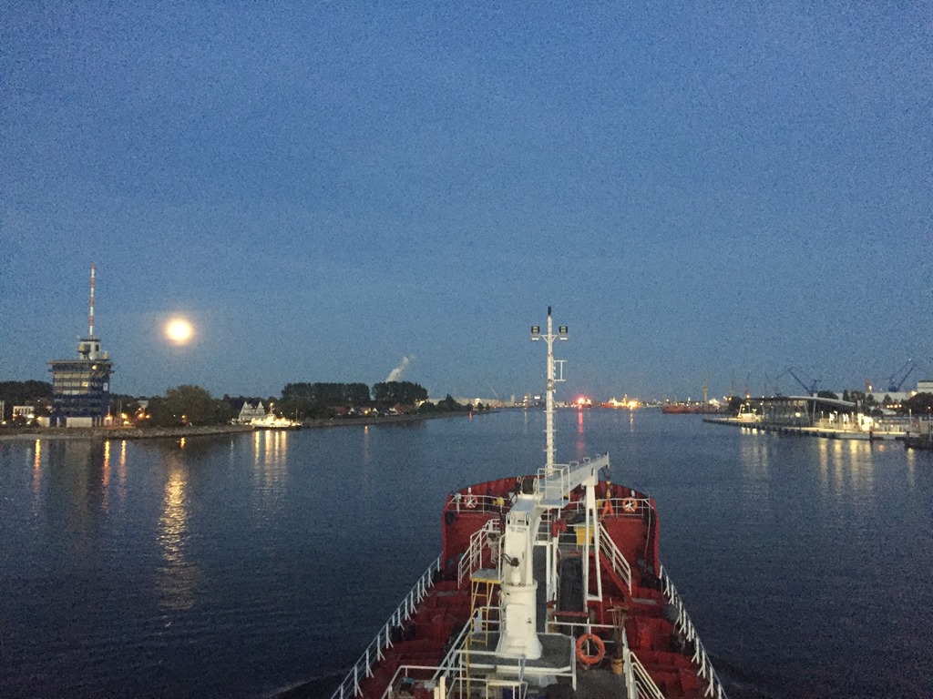 22:15 Går upp på bryggan och tar över när vi närmar oss kanalen in till Warnemunde och Rostock.![]()