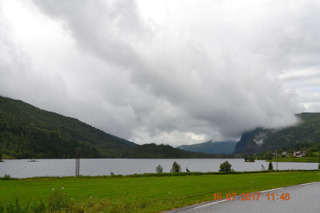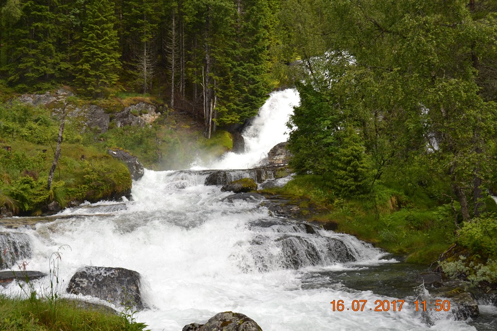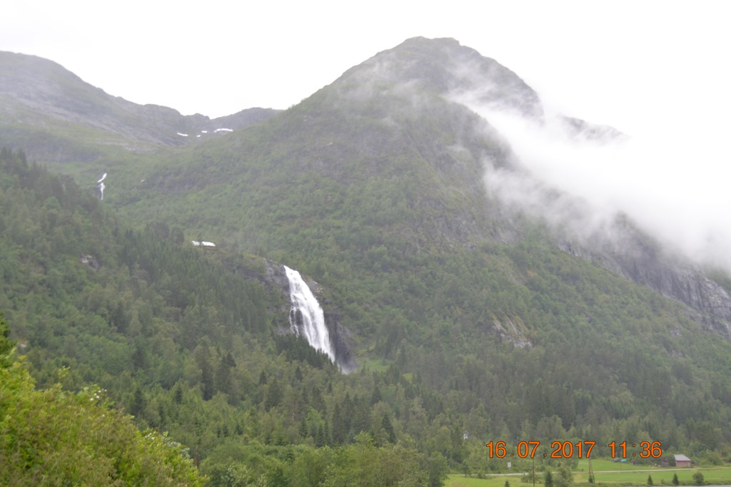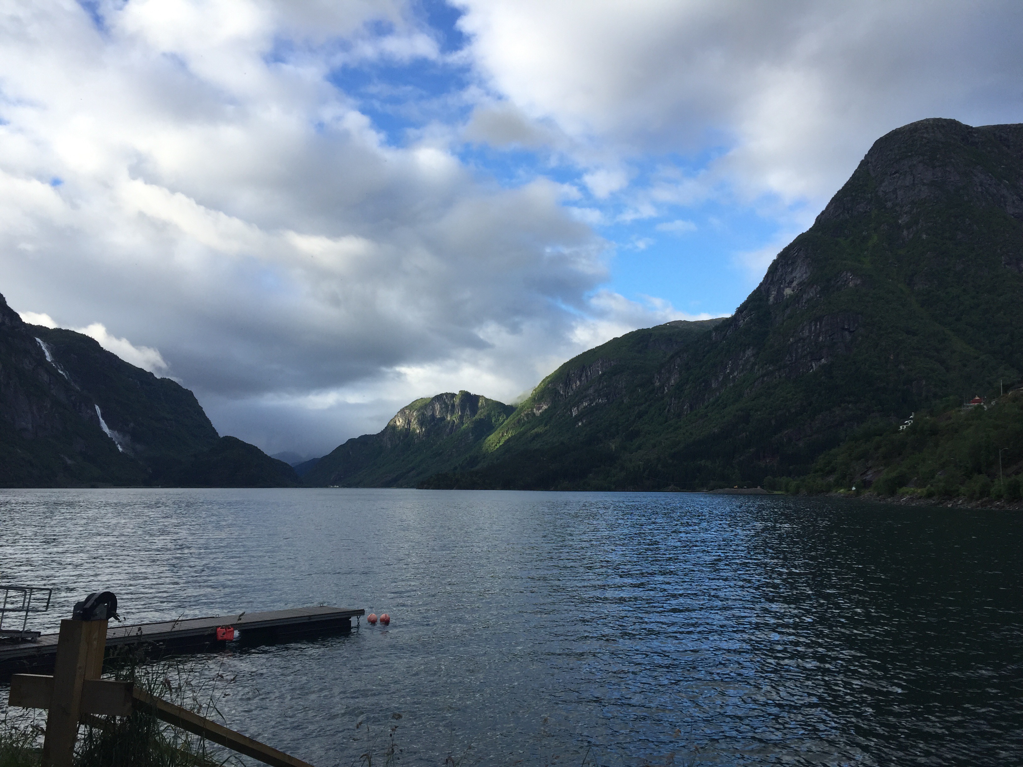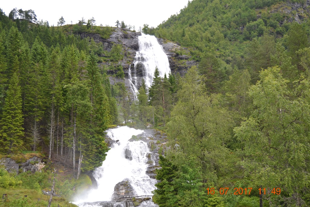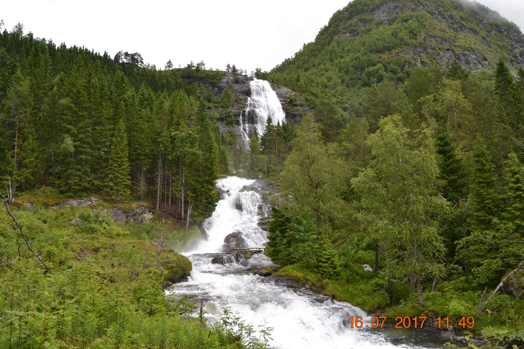 Vi körde över Hardangerbrua och vidare upp till Espelandsdalens Camping. Låg vid en fjällsjö mellan 2 fjällväggar. Var fint väder när vi kom så vi gick en promenad bort till vattenfallet.