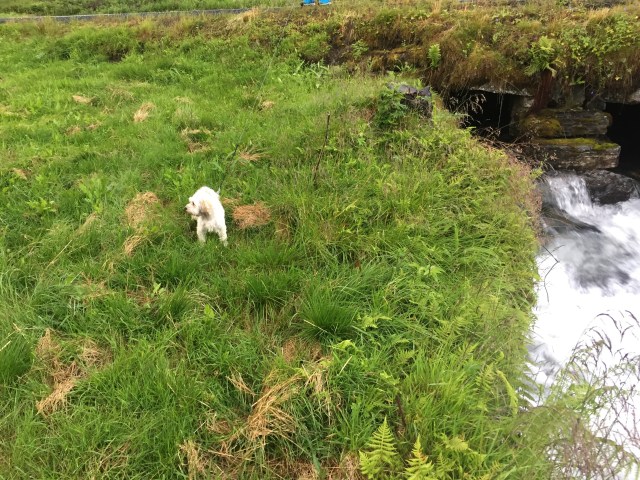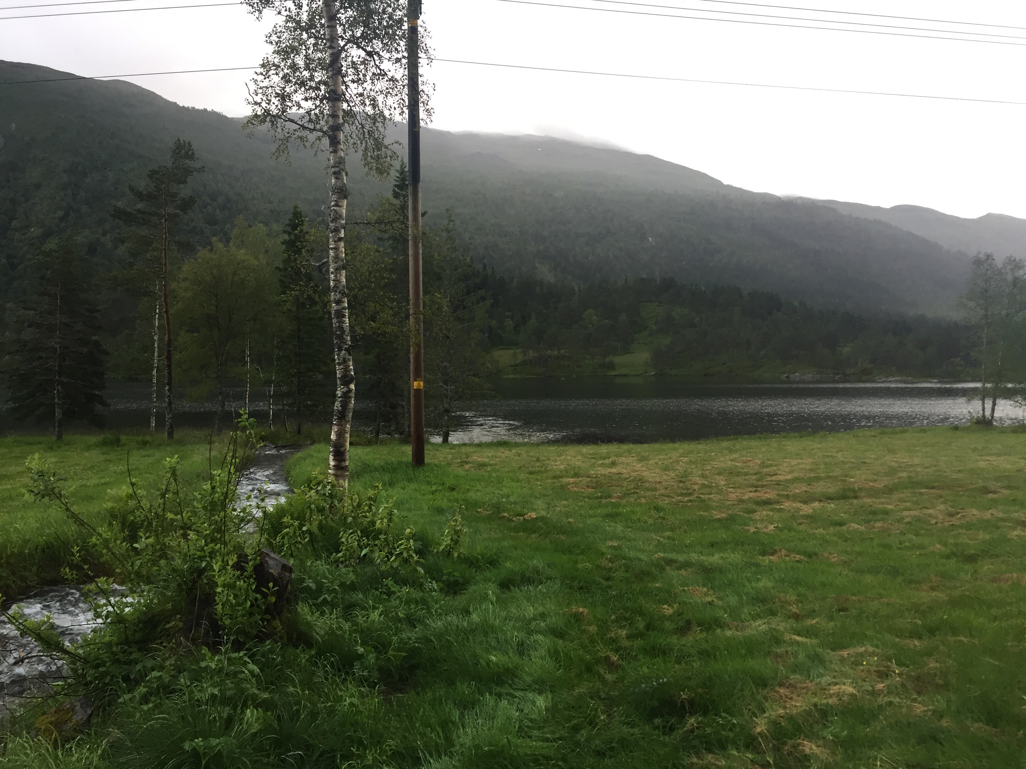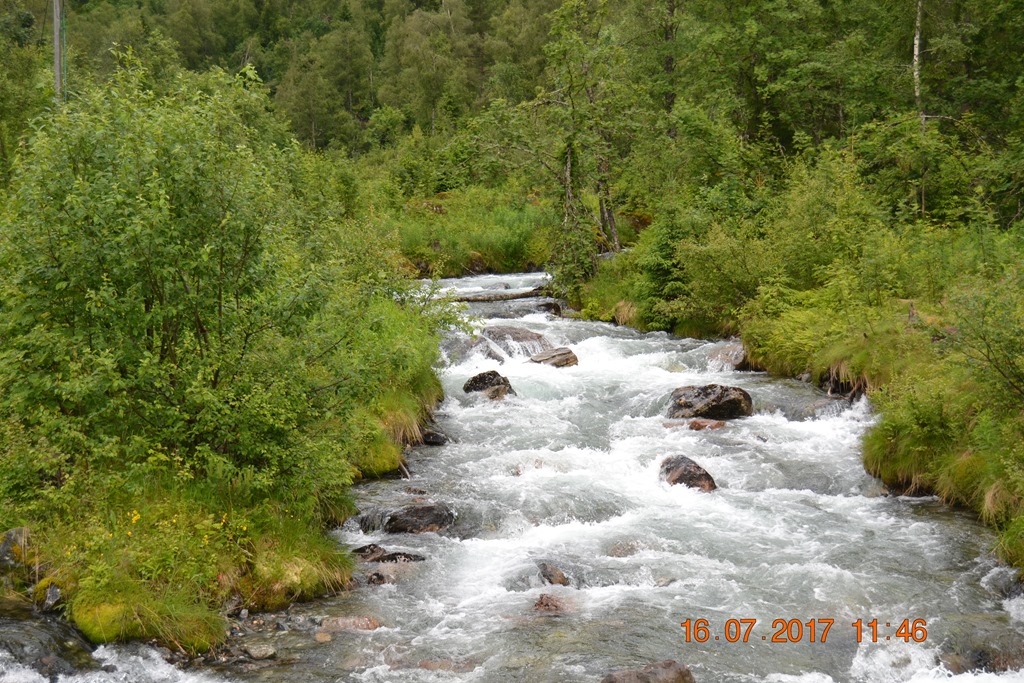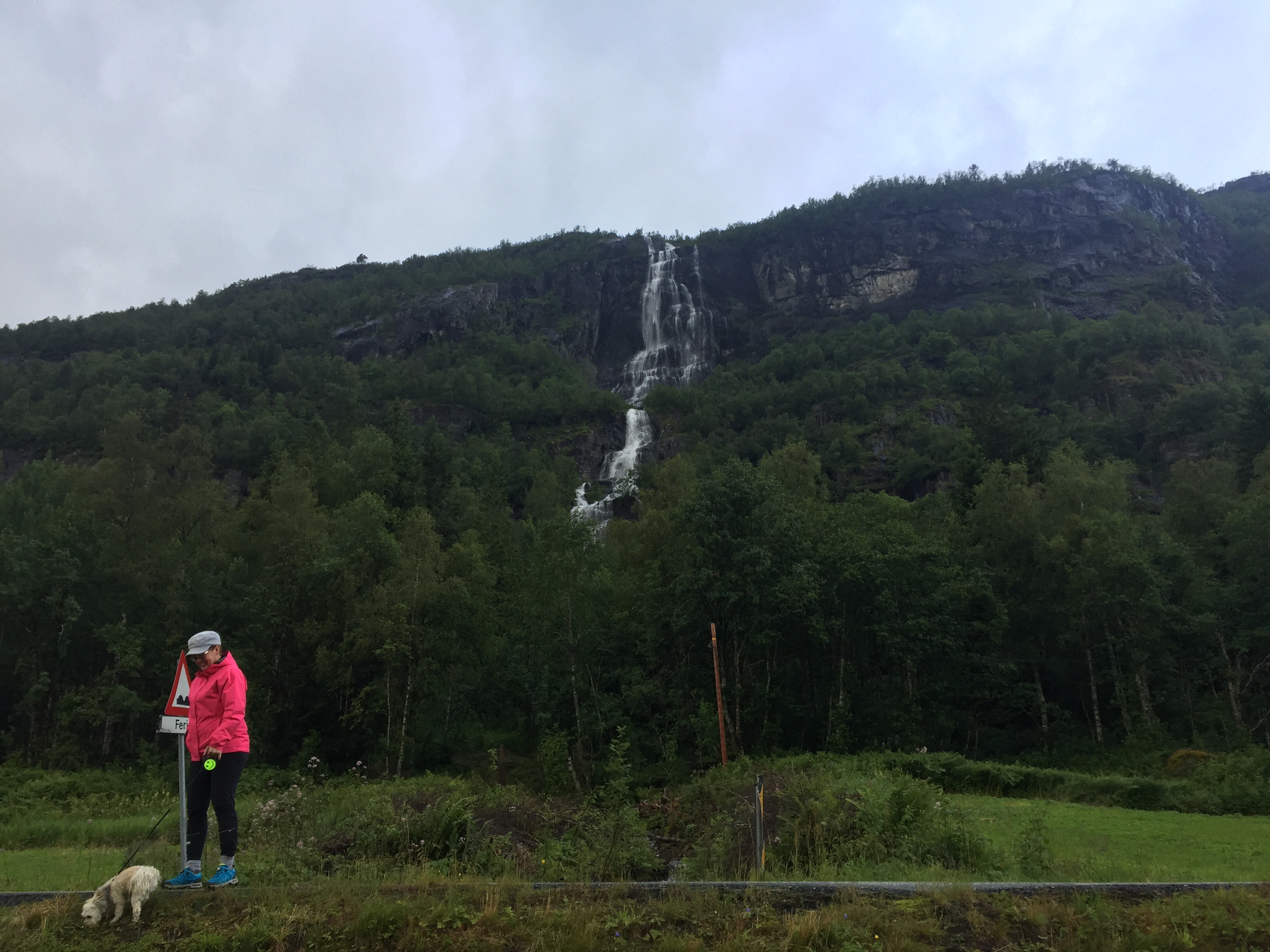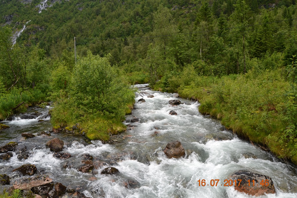 Vi körde över Hardangerbrua och vidare upp till Espelandsdalens Camping. Låg vid en fjällsjö mellan 2 fjällväggar. Var fint väder när vi kom så vi gick en promenad bort till vattenfallet.