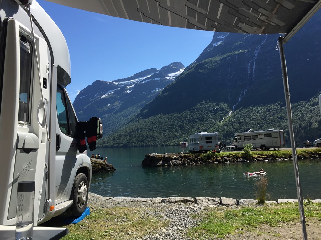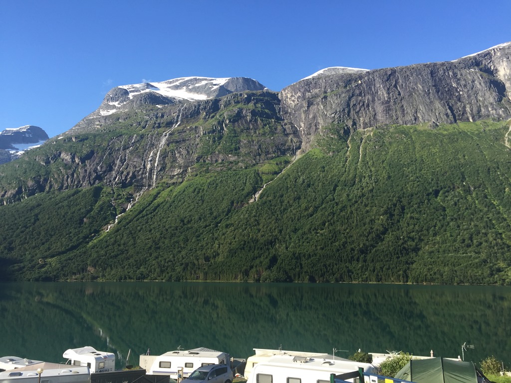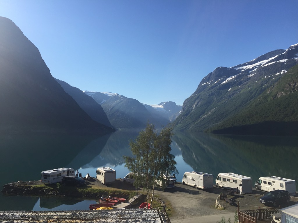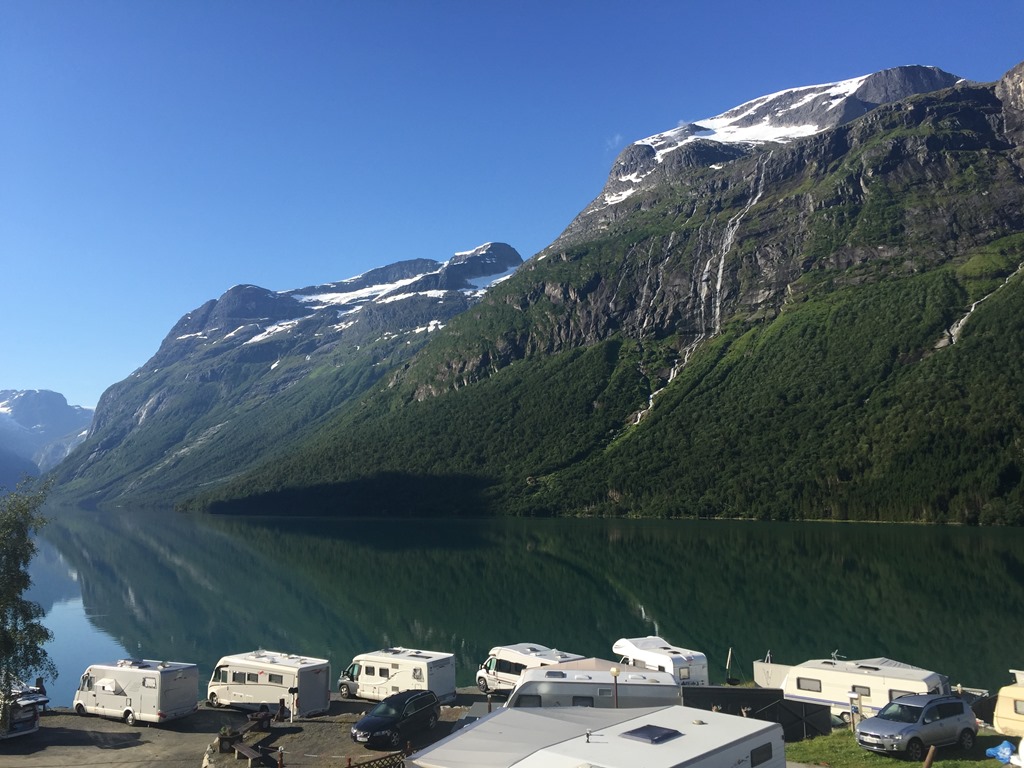Tillbaka vid husbilen så gick jag för att slänga sopor och tömma latrinen. Fick dessutom ordnat så vi kunde få en sjöplats istället. När vi flyttat husbilen så slängde jag mig i sjön och badade men oj vad det var kallt. Kanske inte så konstigt när glaciären rinner ner i sjön.![]()