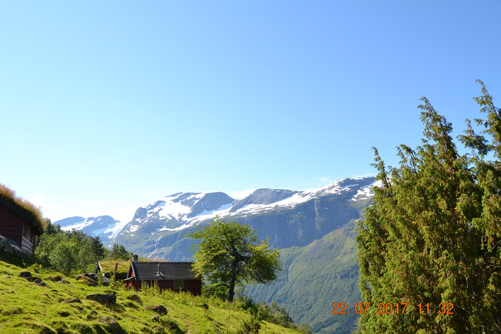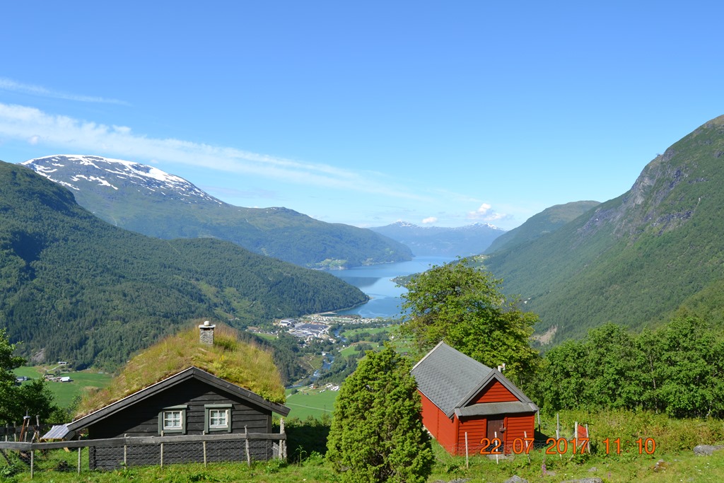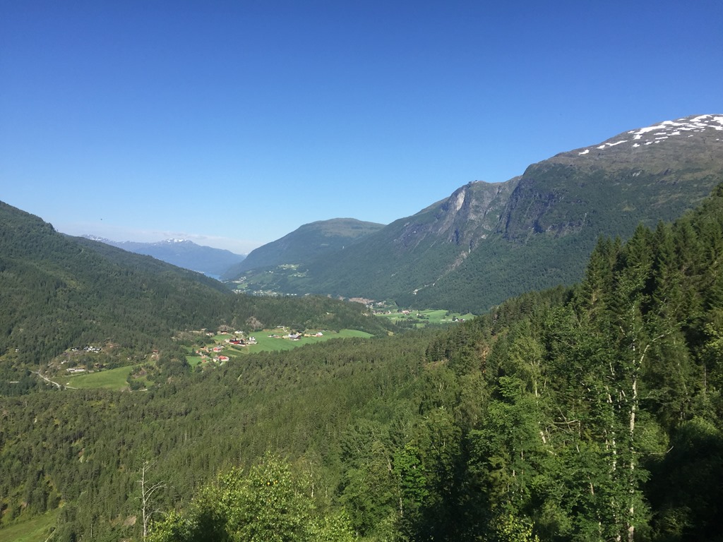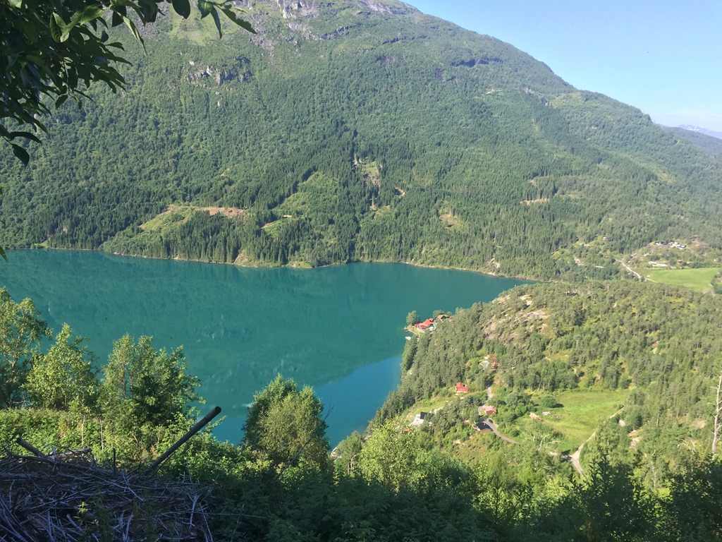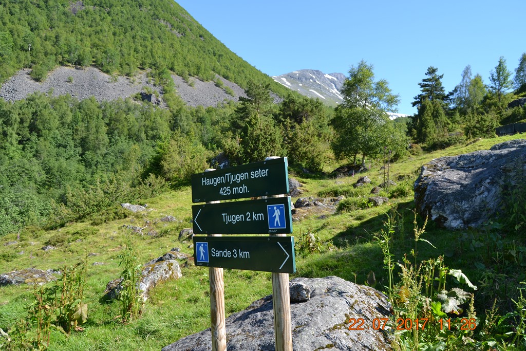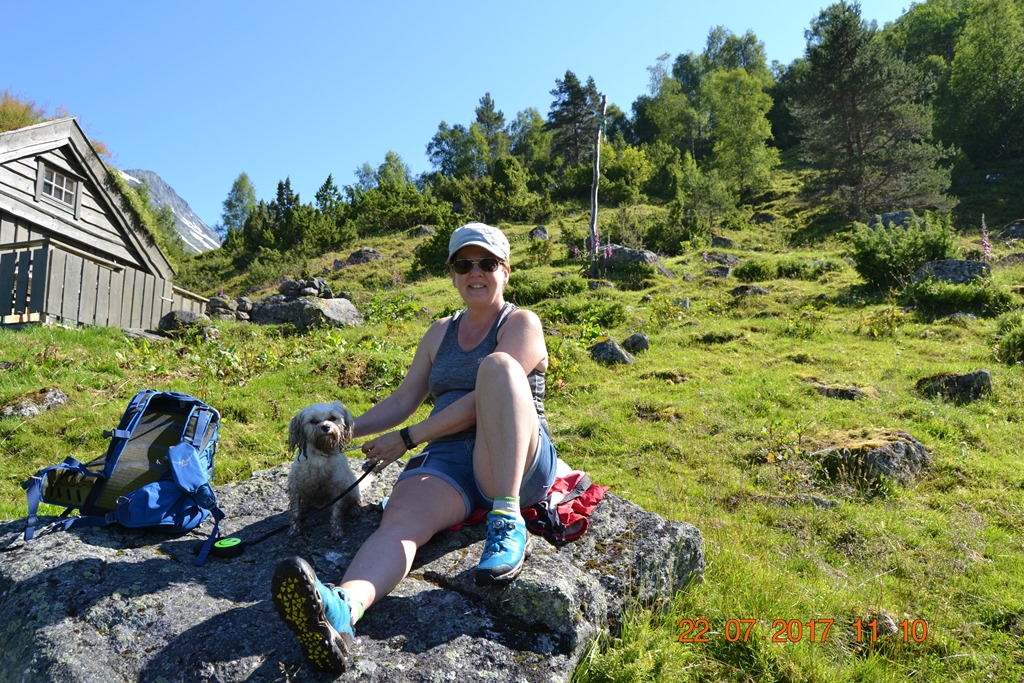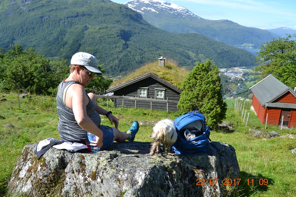 Kom upp till Haugaseter på 425 meters höjd efter 3,1 km vandring i 1,5 timma. Vi åt vår matsäck och drack lite vatten och njöt av utsikten. Chili var ganska skiten och törstig men ville bara jaga fåren.![]()