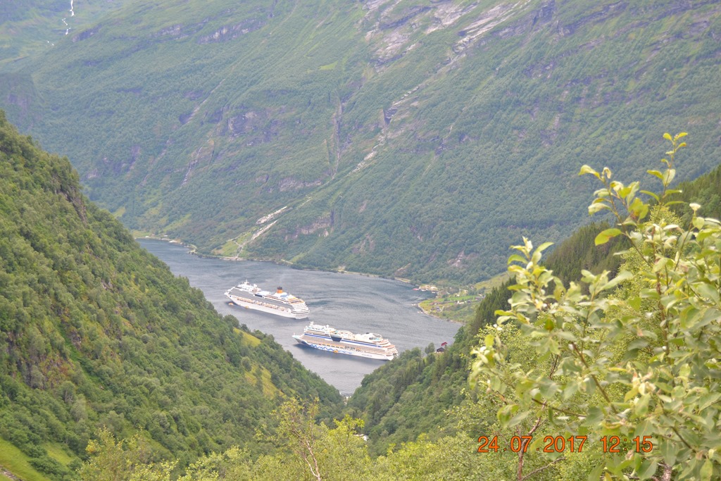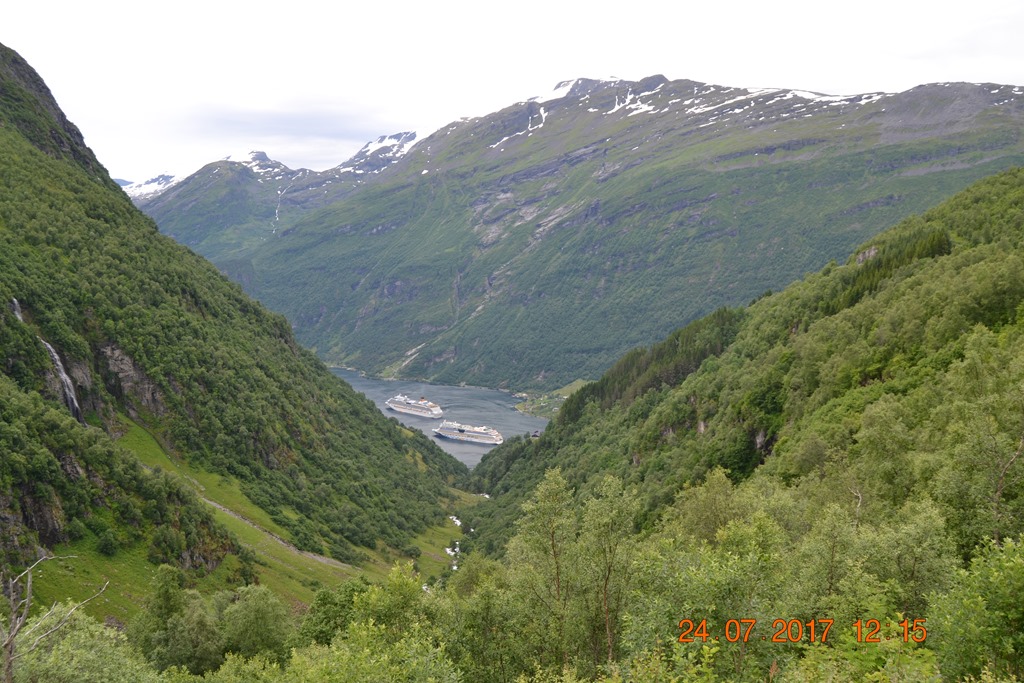 Sedan ner den snirkliga och trånga vägen till Geiranger. Skulle kunna tagit 1000 bilder men vi har varit där så många gånger så det blev bara att försöka ta sig ner. Hamnade mitt i en cykeltävling med.