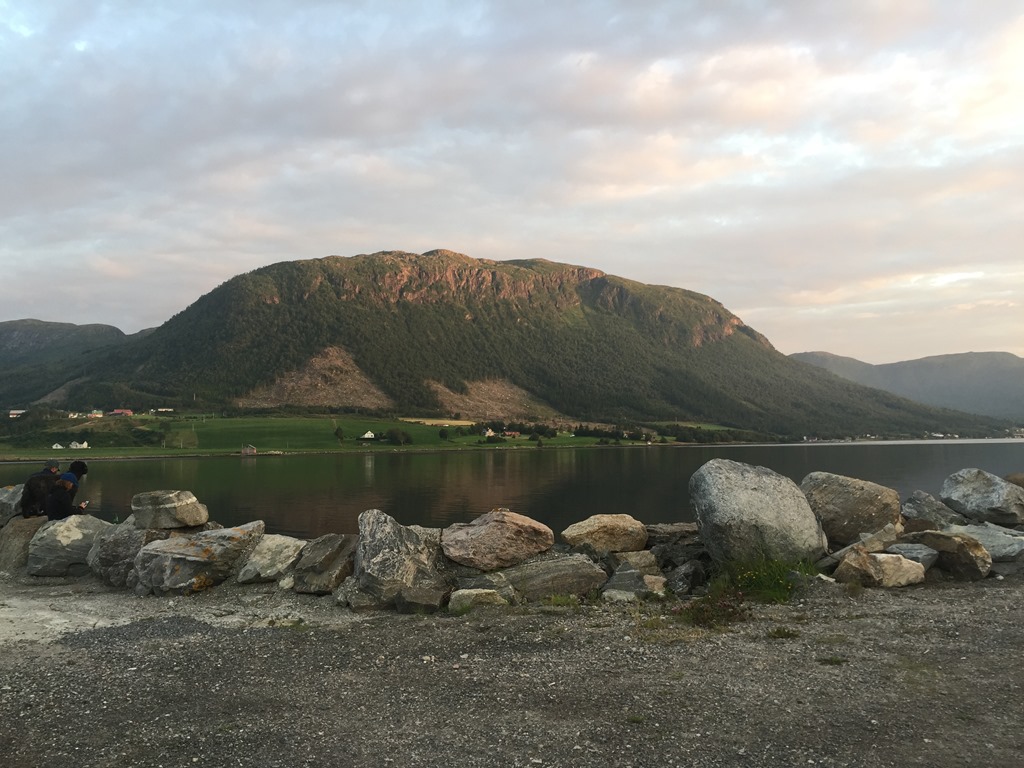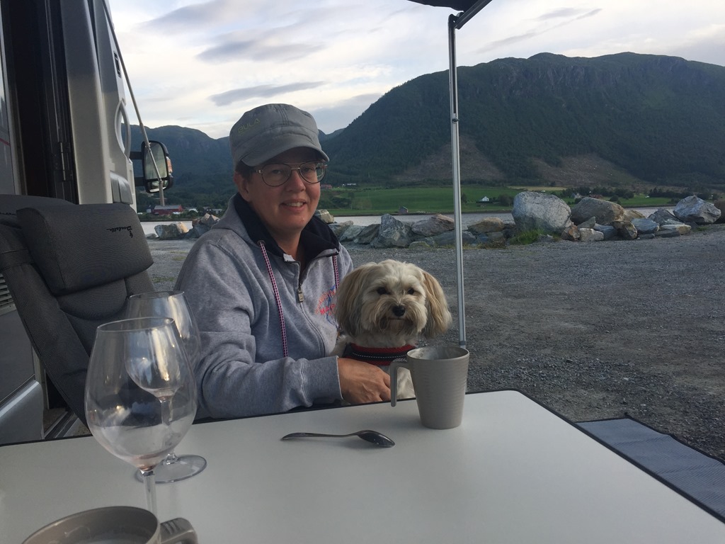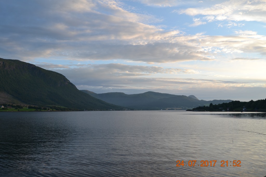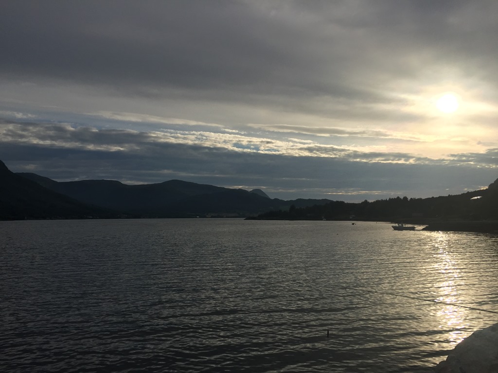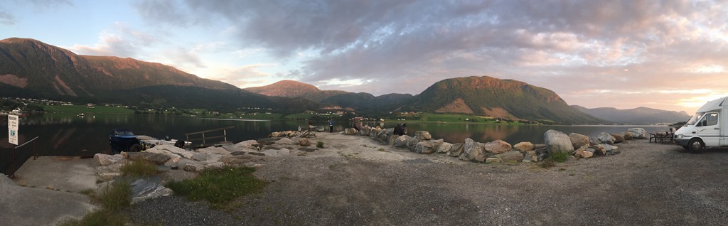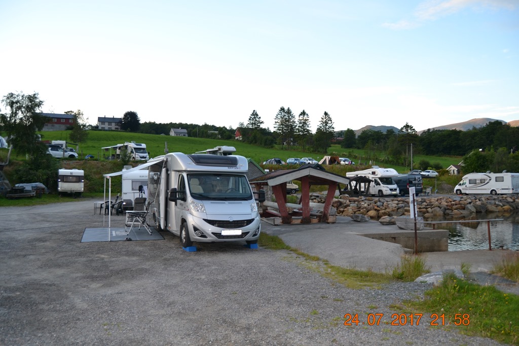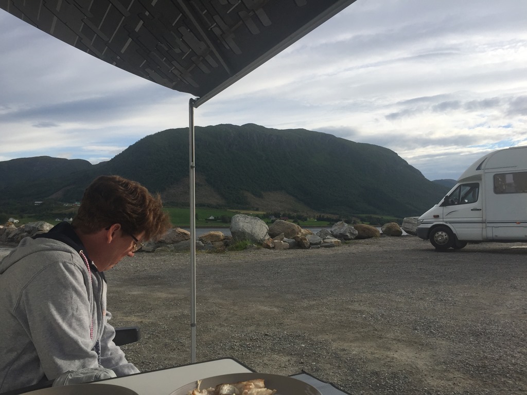 Ja till sist kom vi över och vi var inte säkra på hur långt vi skulle ta oss idag. Vi började bli hungriga. Så vi stannade i Vestnes och tankade samt köpte t-röd. Sedan ner på hamnen och se om det fanns någon ställplats. Det fanns en stor grusplan som vi stannade vid och jag satte igång att röka Brittas fångst från igår. Det var ju inte jättemycket men oj vad gott det blev. Ler med tungan ute