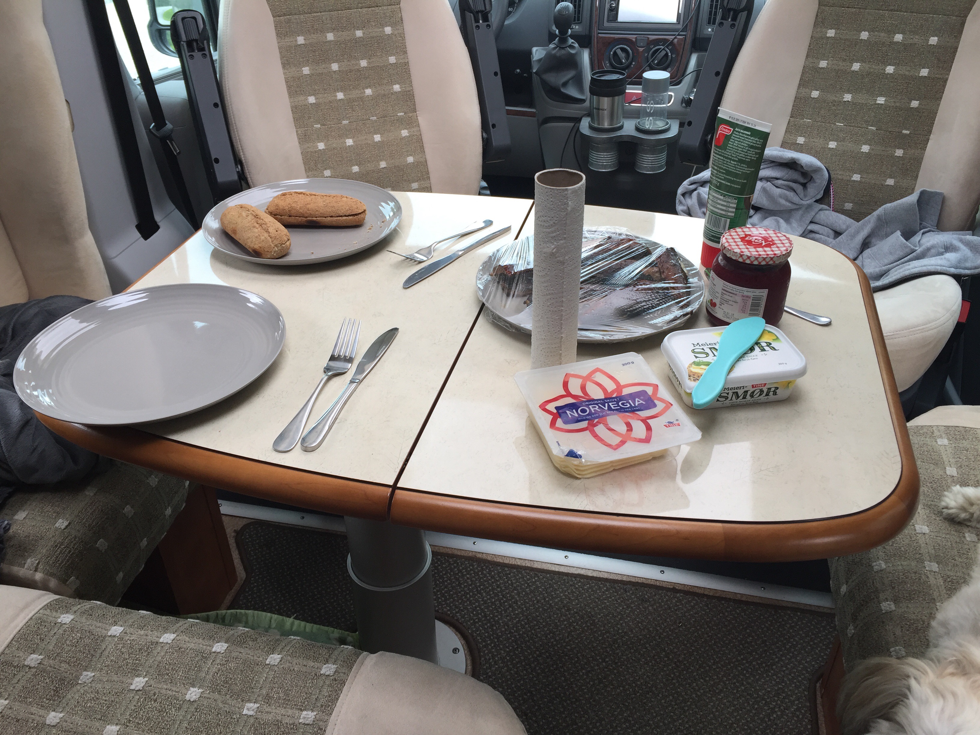 En mil söder om Oppdal stannar vi och ordnar lunch. Det blir rökt makrill, kokta ägg, bake-off bröd och lite pålägg.