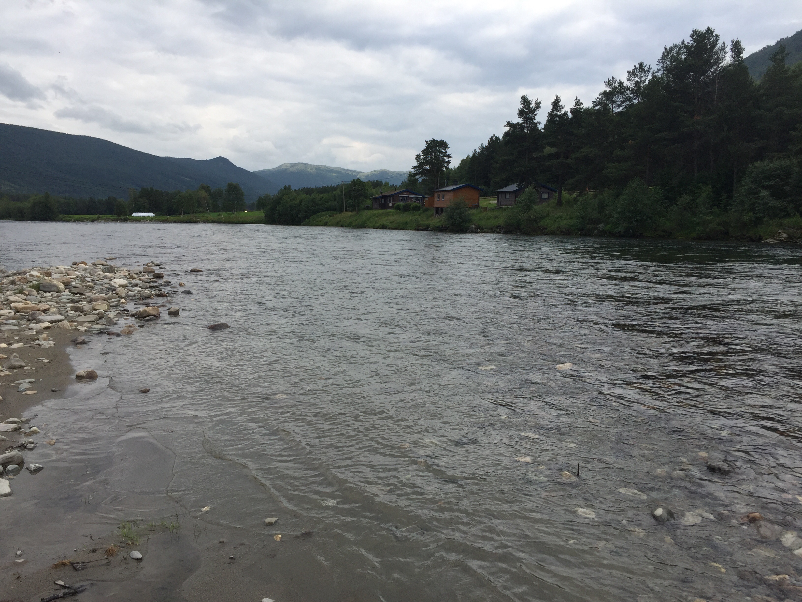 Vid 15:30 tiden så stannar vi söder om Dovre på gDovreskogens Camping. Vi går ner en tur till älven och tittar. Ska finnas gott om öring i älven.