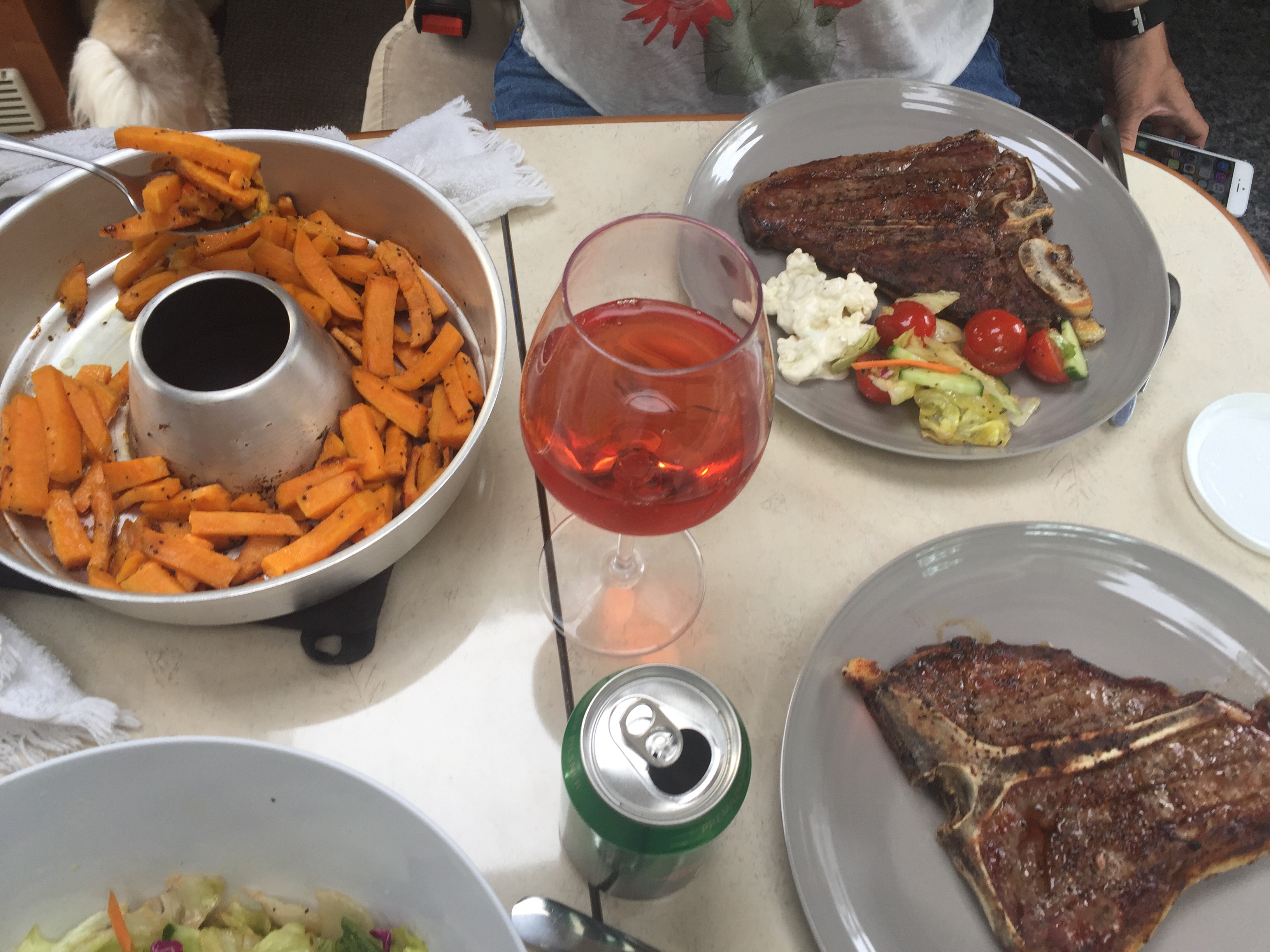 Britta vilar en stund innan jag börjar med maten. Det blir grillad T-bone steak, sallad och sötpotatis i omniaugnen.