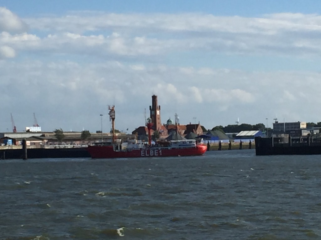 15:15 Tar lots vid Elbe boj och fortsätter upp genom Elbe och får snart tidvattnet emot oss så farten går ner till 5 ´knop. När vi passerar Cuxhaven så kommer det gamla fyrskeppet ut ur hamnen.![]()