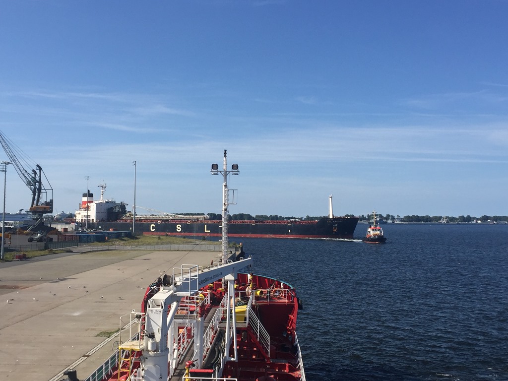 16:15 Avgår från Diana och nu har vi blivit så sena så en stor bulkbåt är på väg in och vi måste vänta på den. Lägger mig stopp i bassängen och väntar innan vi kan fortsätta ut.![]()