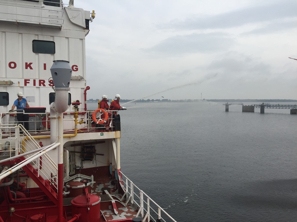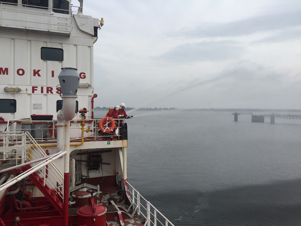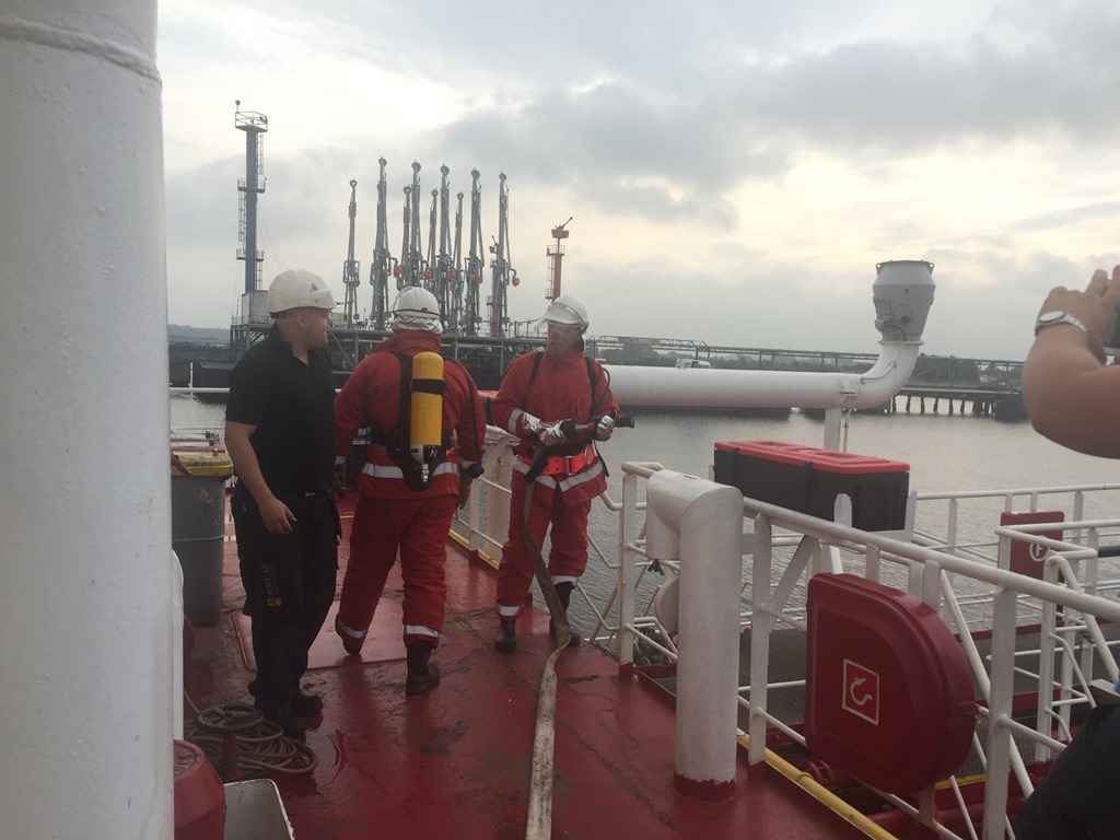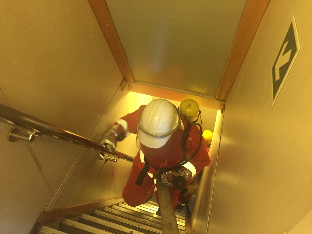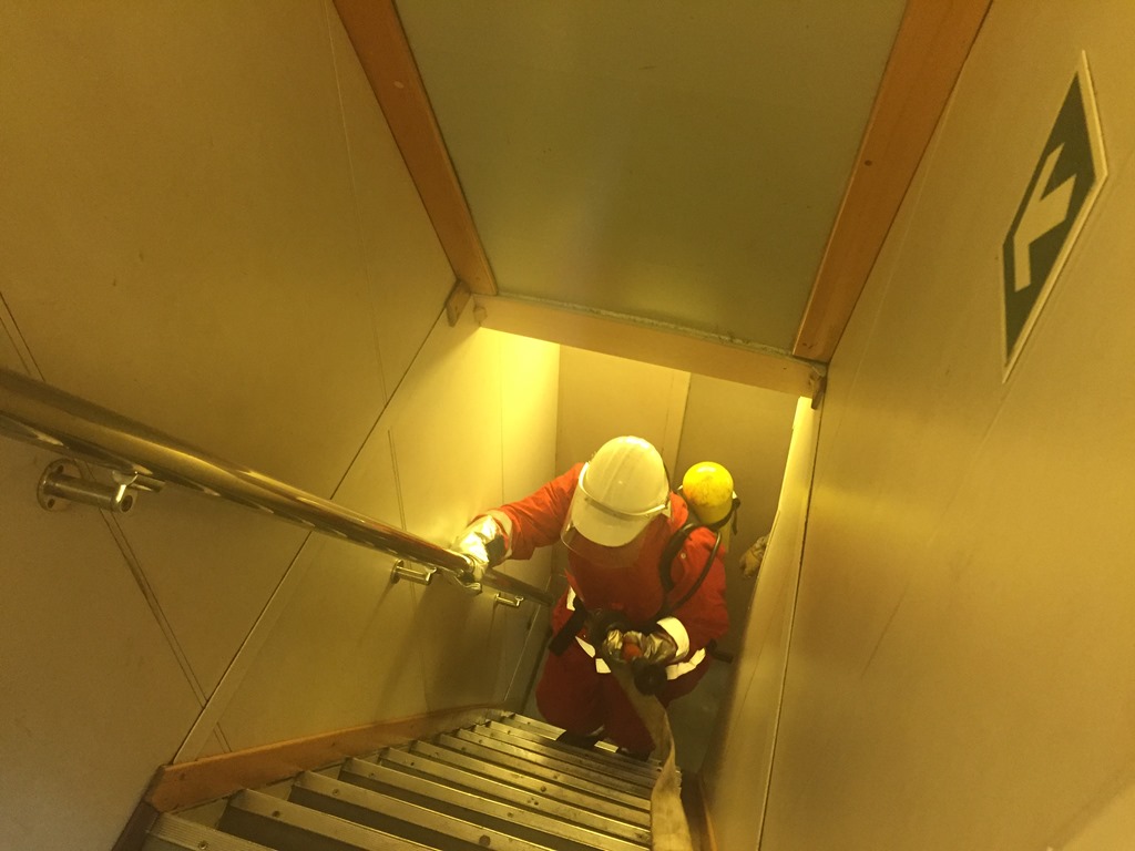 Efter frukost så har vi lite övningar. Börjar med Enclosed Space drill där de får lära sig hur vi skall göra vid ingång i lasttank eller annat stängt utrymme såsom ballast tank eller kättingbox. Därefter Firedrill med brand i inredningen som de skall ner och släcka.![]()