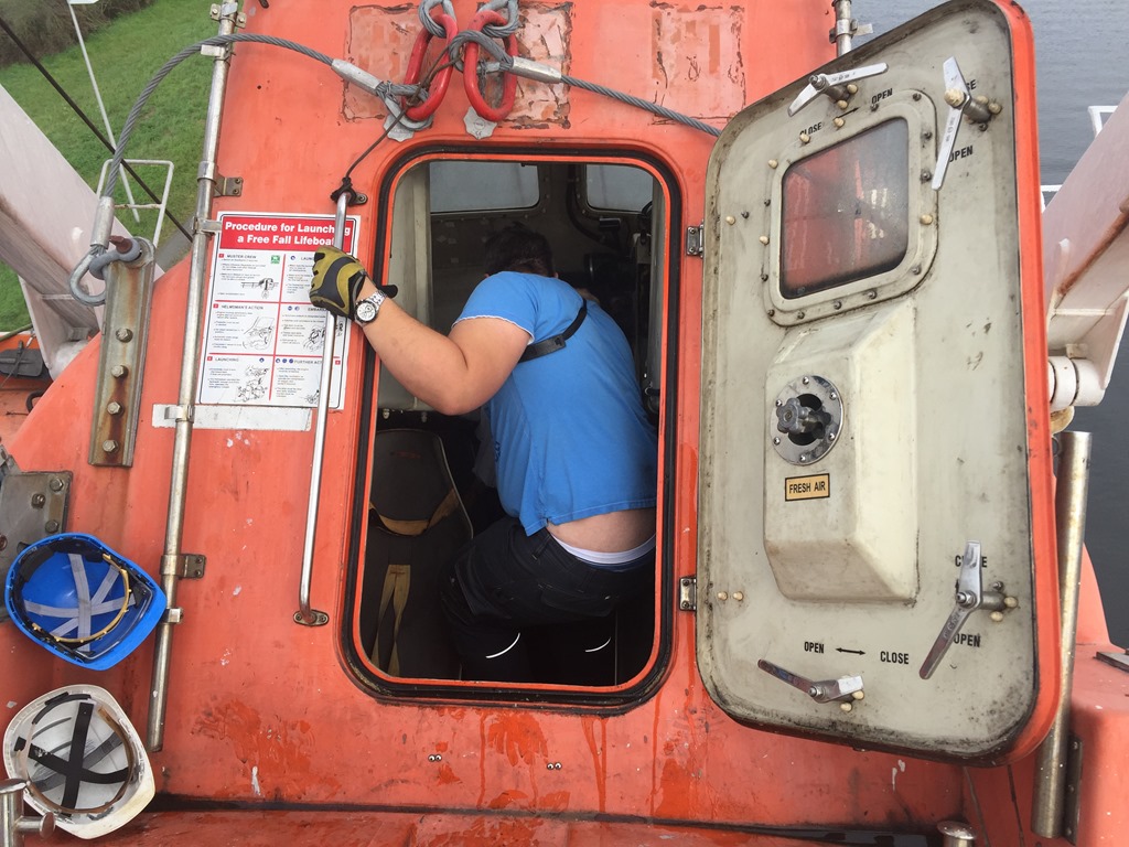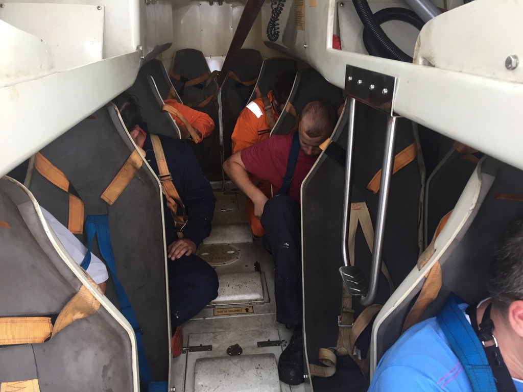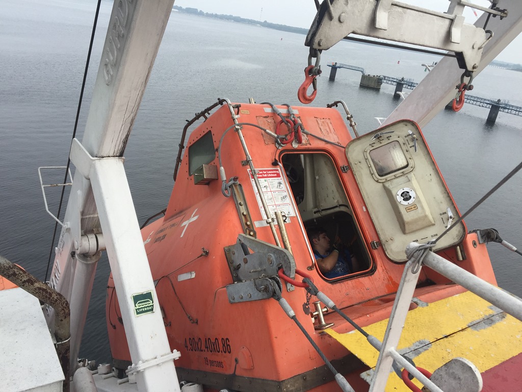 Vi avslutar sedan med Abandon ship drill där alla samlas på bryggan med sina överlevnadsdräkter innan vi går in i Fritt fall båten och spänner fast oss.![]()