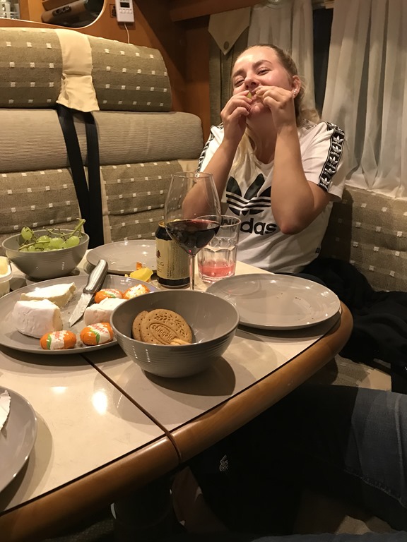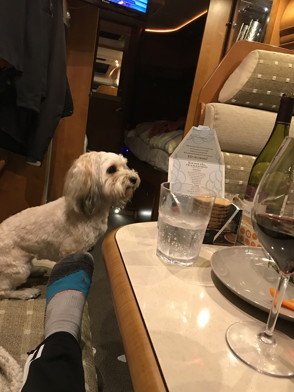 18:30 Framme vid Lundåkra hamnen i Landskrona och fick oss en plats och lite ström. Det var många bilar här och fullt inne på restaurangen. Men jag gick en runda med Chili innan vi satte oss med lite ostbricka och rödvin.