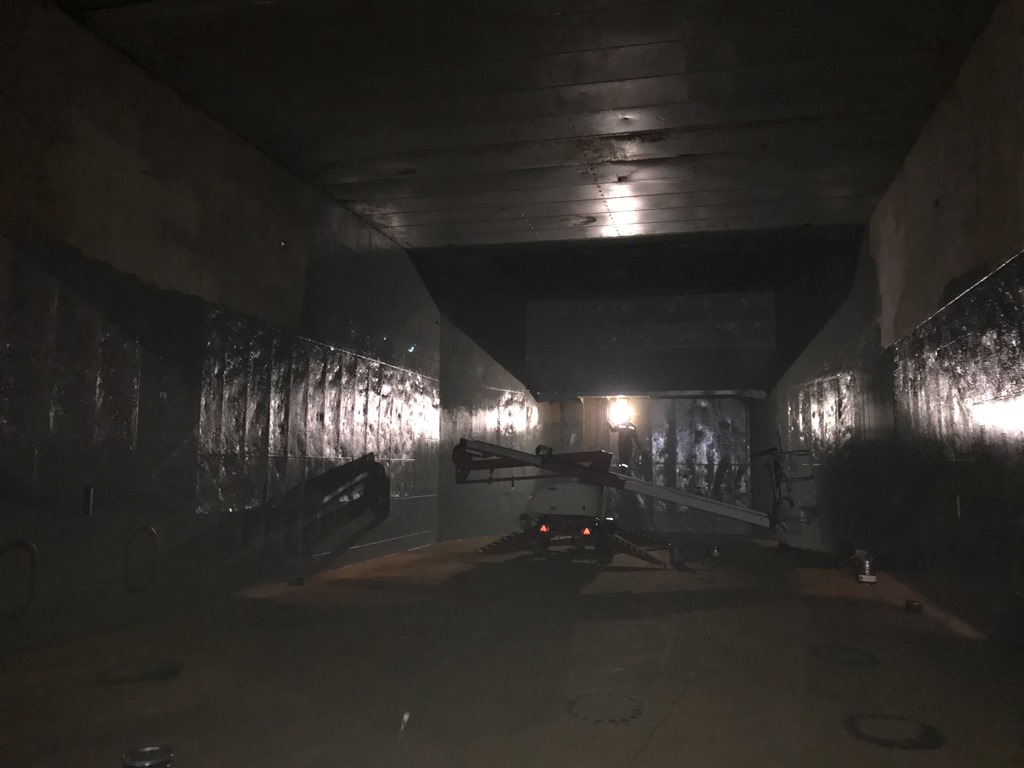 Sent på eftermiddagen är de färdiga med de första hålen och vi kan sätta skottet på plats och se så det passar. Det gick fint på plats så vi lägger på alla luckor för att det skall torka bättre i lastrummet.
