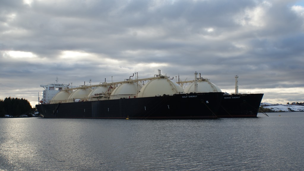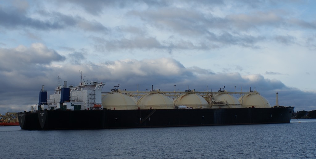 13:00 Vaknar och går upp på bryggan för lite kaffe och ser när vi passerar genom Karmsundet där det ligger några gastankers i upplag.