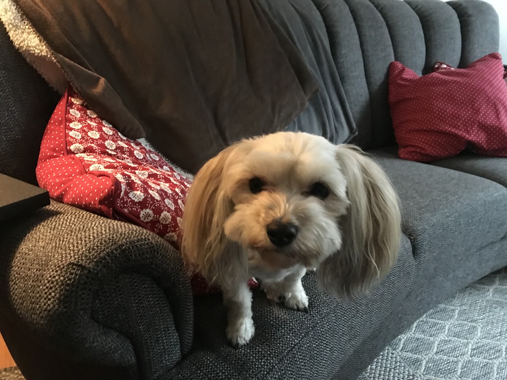 Det satt en liten hund och ville komma upp i knät på mig.