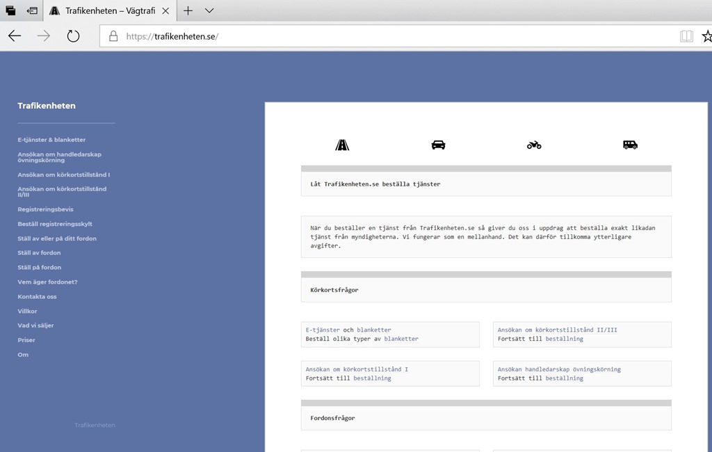 Måste bara varna för ett företag som heter trafikenheten. Om man söker på nummerskylt, handledarbevis och annat som egentligen skall beställas från Transportstyrelsen så tar sökmotorn först fram “Trafikenheten”.