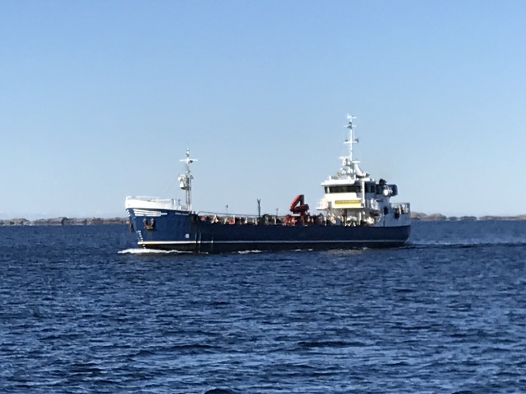 14:00 Går av vakten när vi passerat Steinssundet och äter lite innan jag går en runda på däck för att se över luckorna och att allt är i ordning. Möter då en gammal svensk tankbåt som är byggd på Kållandsö 1959.