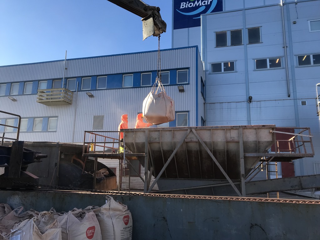 När vi fått ombord MOB båten igen så går jag ochn hjälper till med lossningen av säckar. Det är folk från anlägget som står på kajen och skär hål i säckarna.![]()