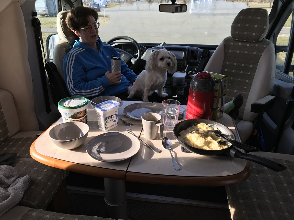Vaknade till en riktigt fin dag och det var nästan vindstilla när jag och Chili gick längs stranden. Tillbaka i husbilen gjorde jag lite äggröra till frukost och det blev lite youghurt och kaffe med.