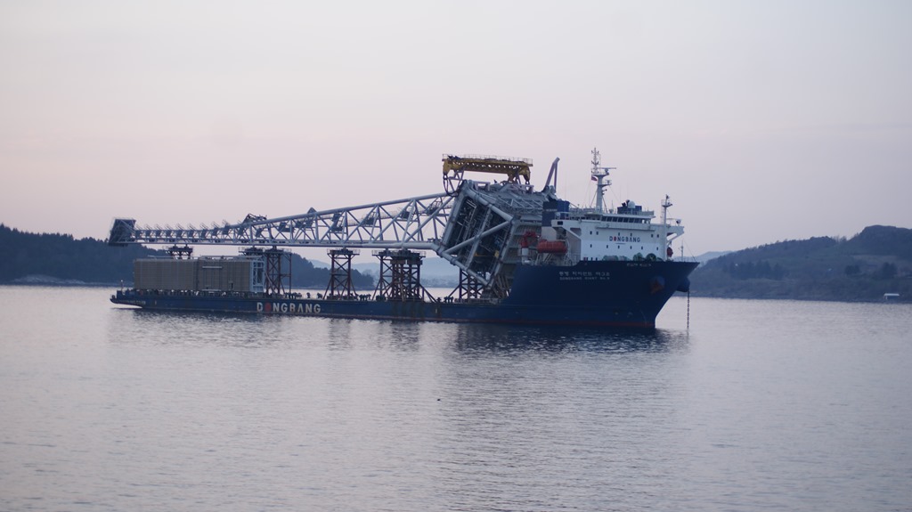 Även ett Heavy Lift fartyg “Dongbang Giant No3” som är lastad men något till en plattform.