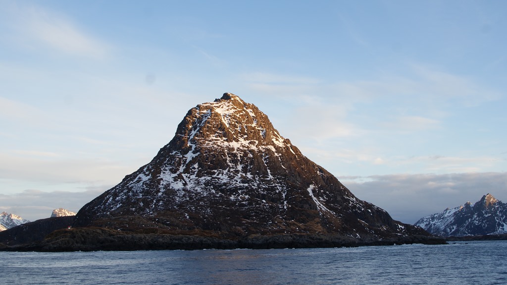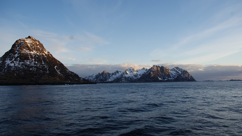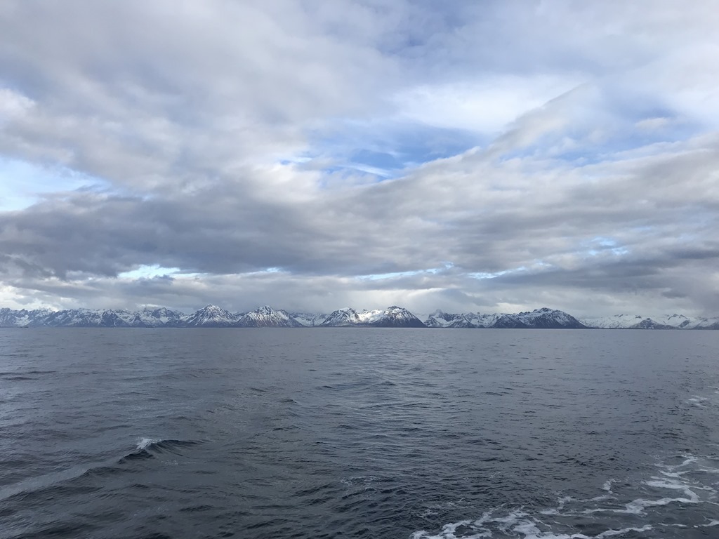 08:00 Kommer på vakt när vi passerar Fuglöy söder om Bodö. Fortsätter norrut förbi Bodö och ut på Vestfjorden. Inte mycket vind och bara lite dyning så det är faktiskt riktig behagligt väder. Skulle bara varit lite mindre moln och mer sol.