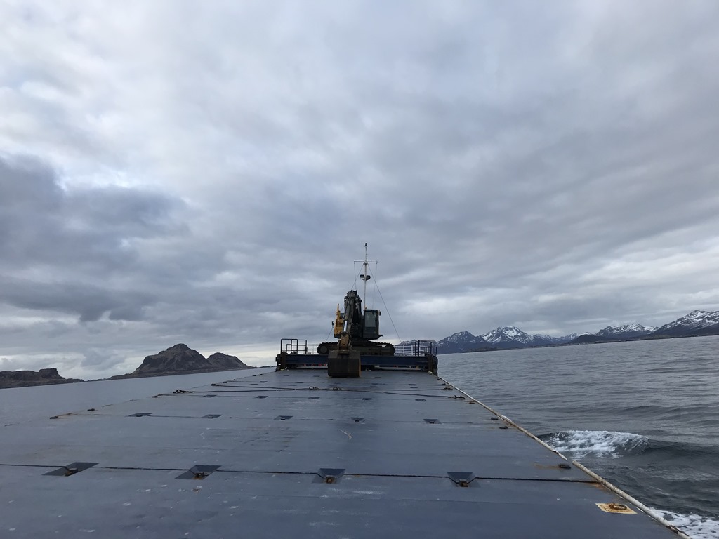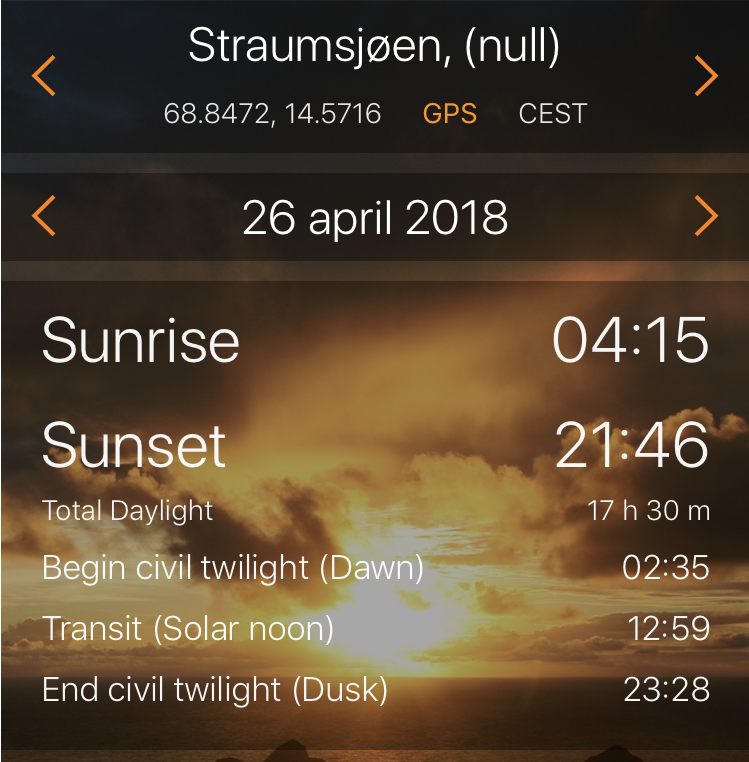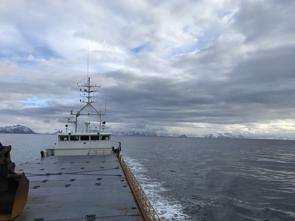 18:00 Vaknar och går upp för att se var vi är. Vi har gått igenom Gimsöystraumen i Lofoten och passerar snart Bö i Vesterålen.